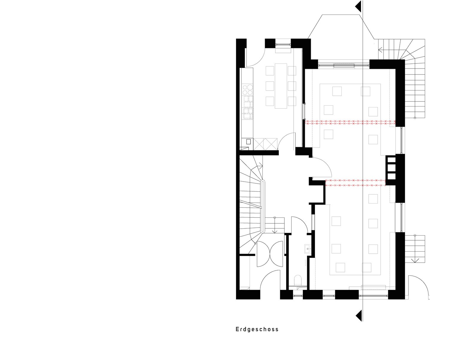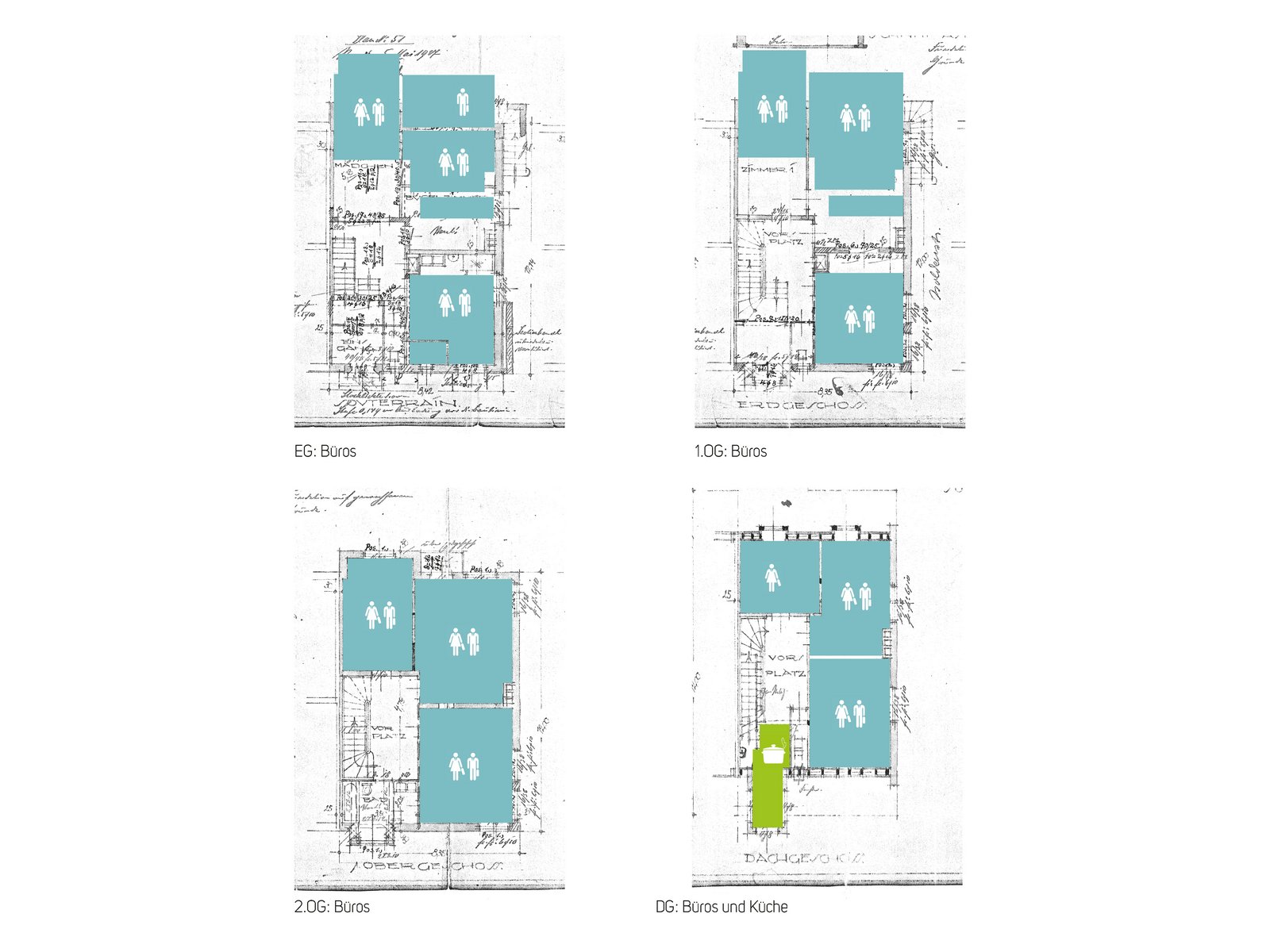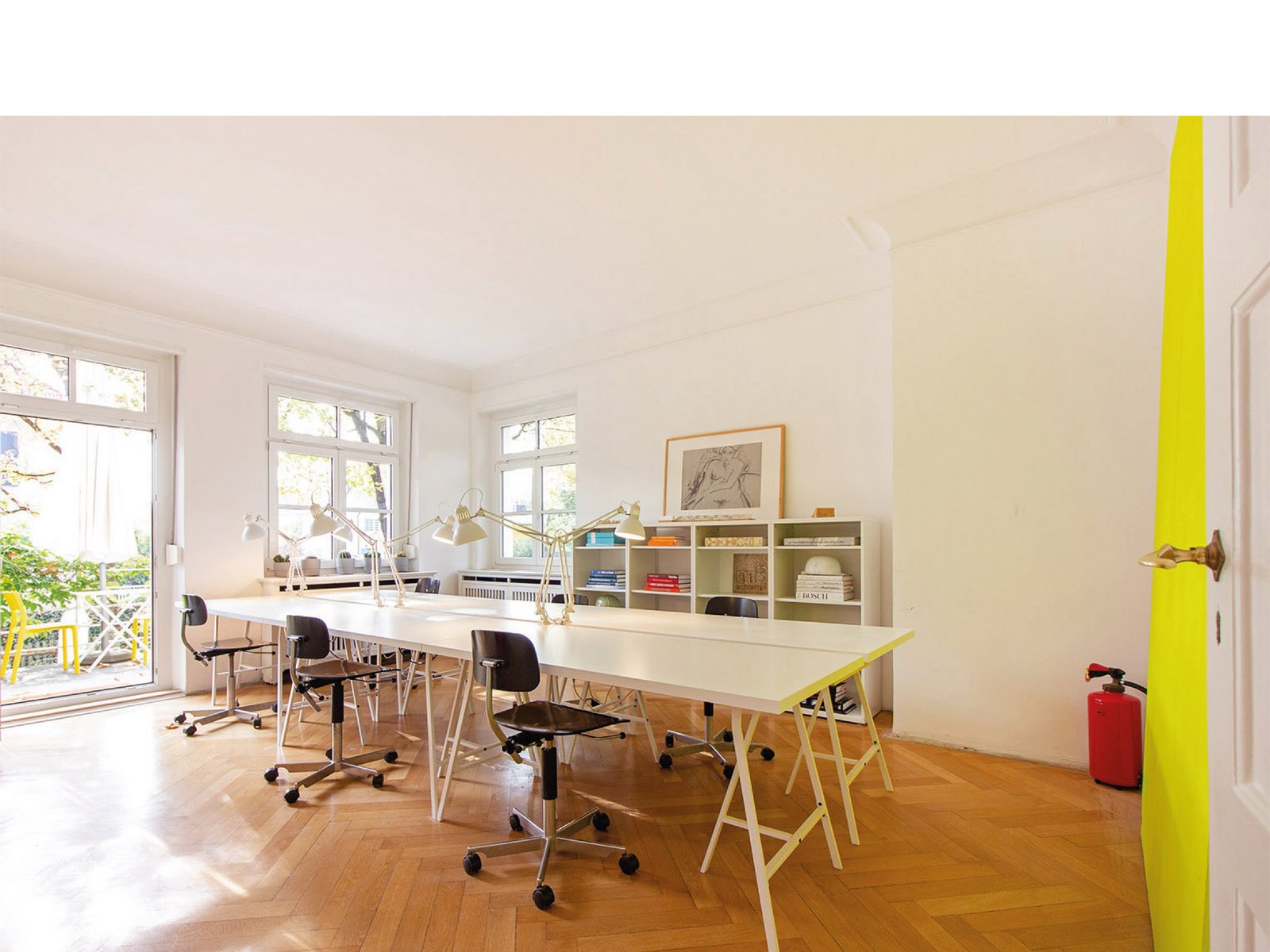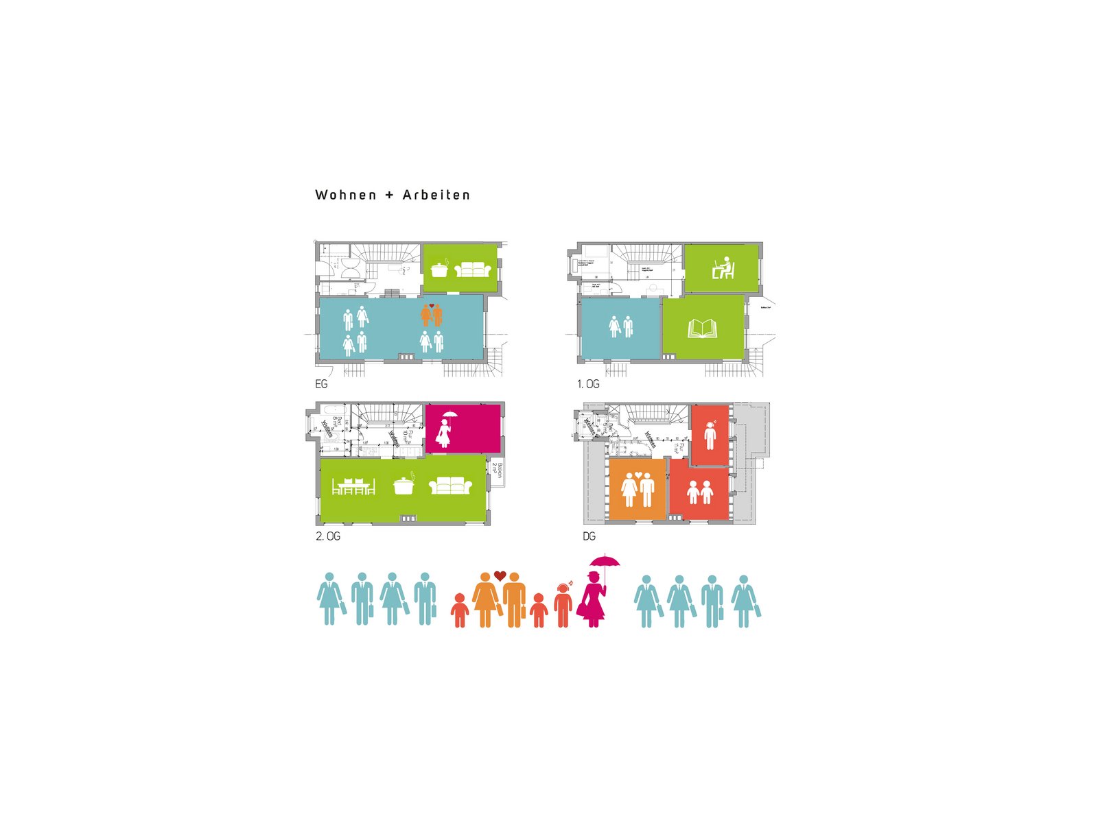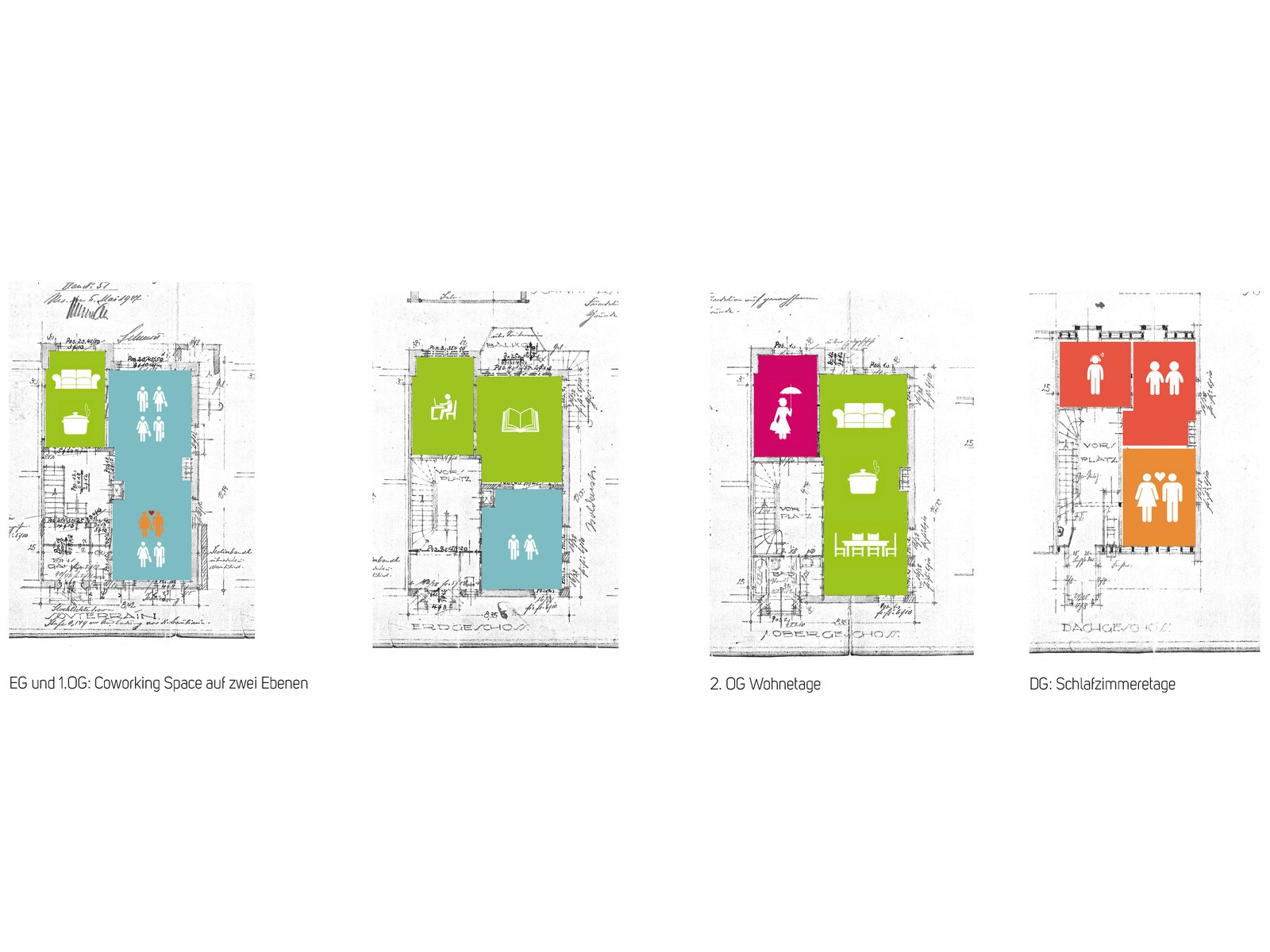 Die Gesellschaft ändert sich, und das verlangt auch neue Ideen in der Architektur, sowohl im Zusammenleben als auch im Zusammenarbeiten in der Stadt. In dem großbürgerlichen 380m² großen Reiheneckhaus aus den 20iger Jahren wurden die ehemaligen Bedienstetenzimmer einschließlich deren Arbeitsräume (Küche, Bügelzimmer und Waschküche) und das Hochparterre einer zeitgemäßen Nutzung geöffnet werden. Wie auch früher, soll in dem Haus gewohnt und gearbeitet werden, jedoch unter der Maßgabe, dass die Bewohner dort selbst ihren Lebensunterhalt verdienen bzw. einen Beitrag zum Stadtleben in unsere Gesellschaft leisten und dort einen kreativen, lebendigen Stadtbaustein schaffen.