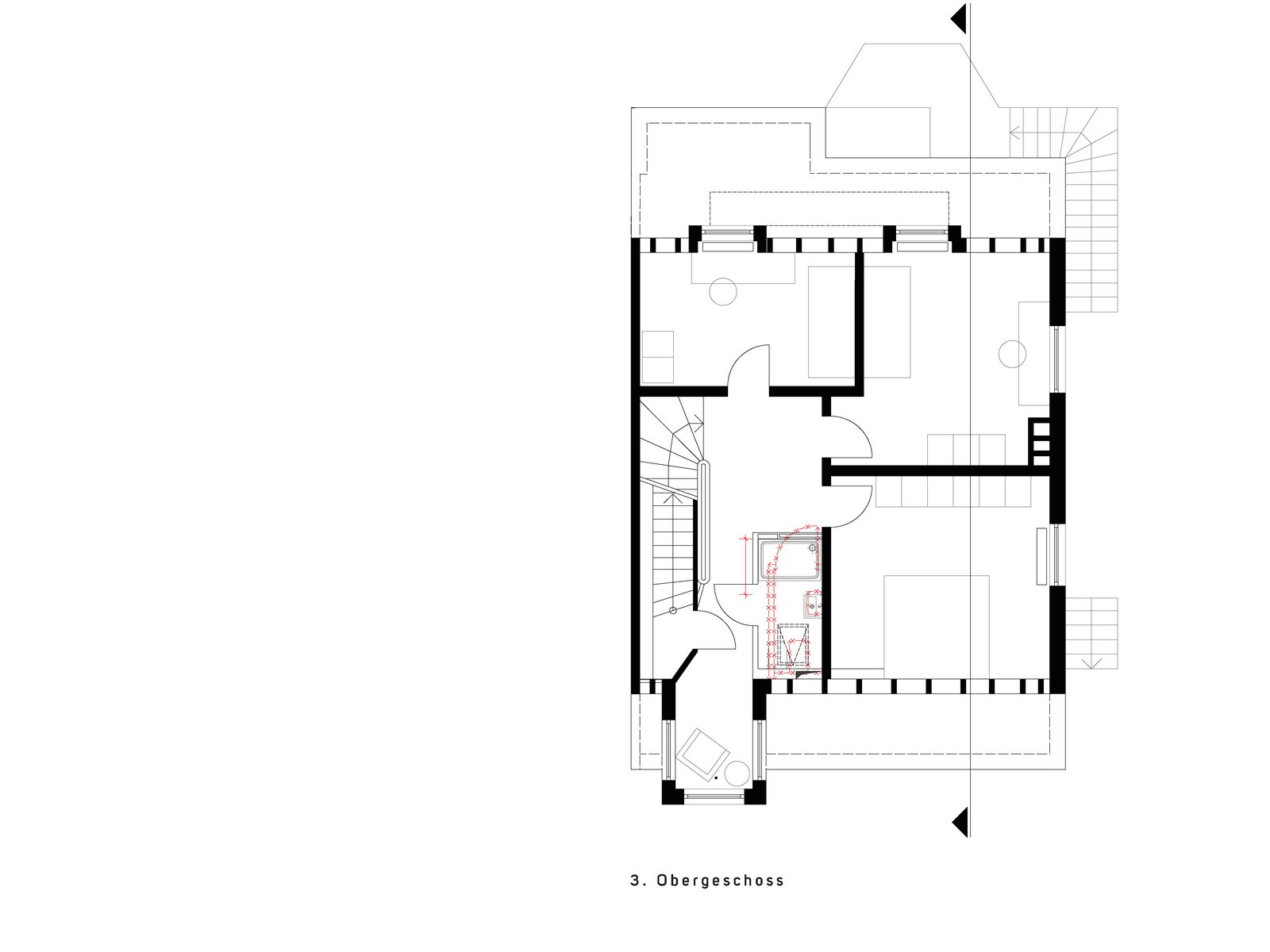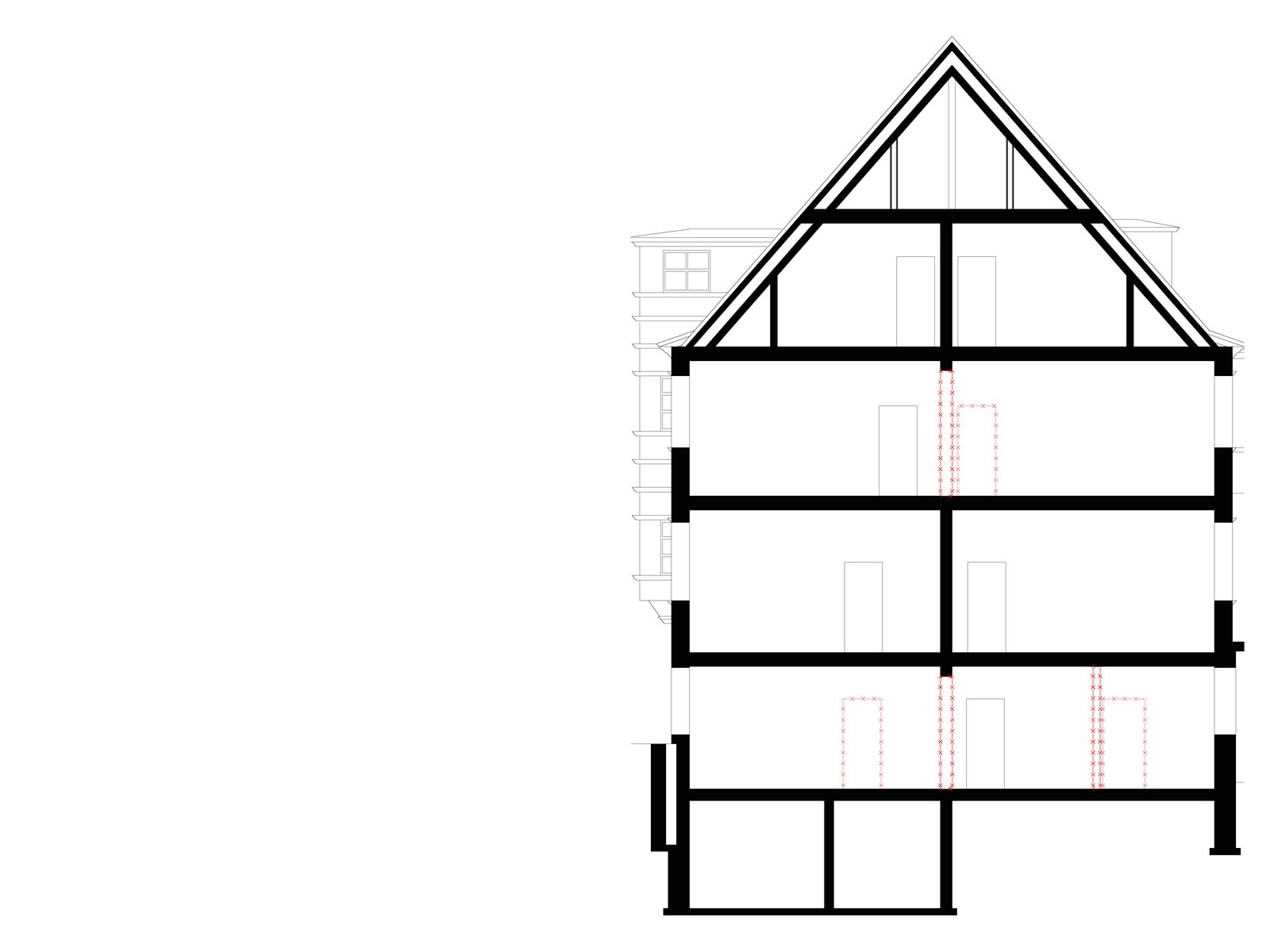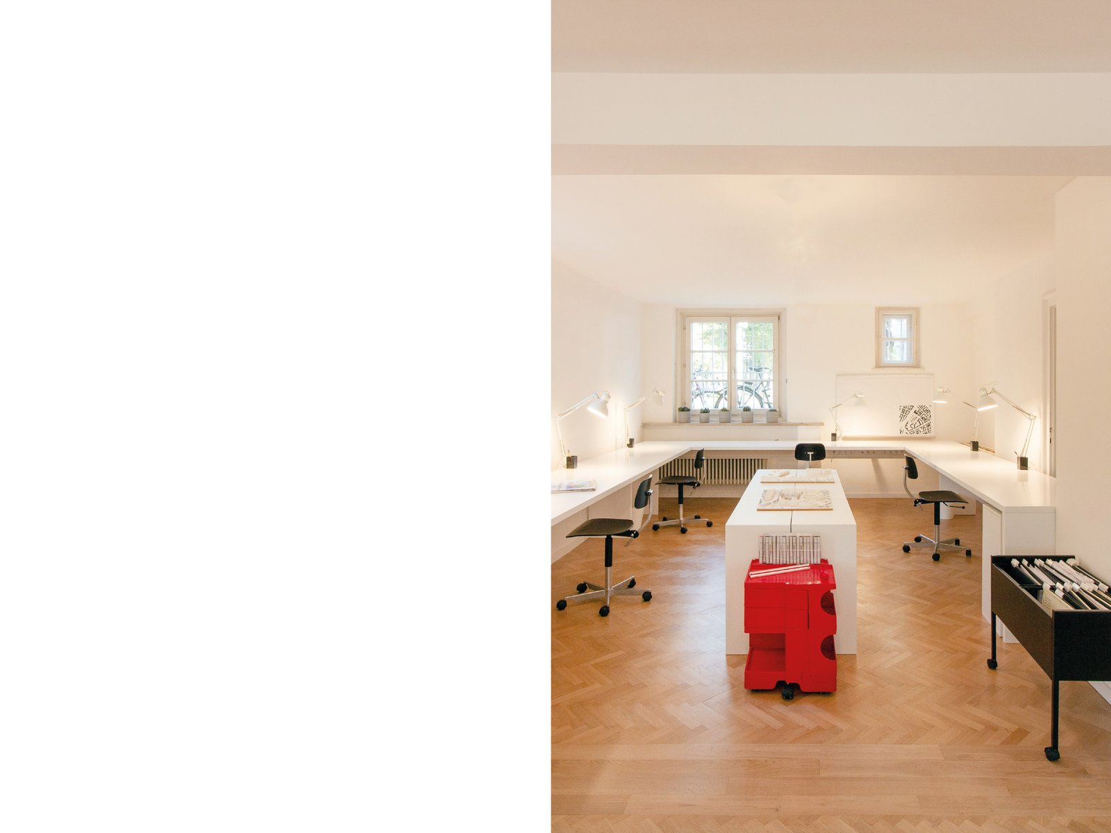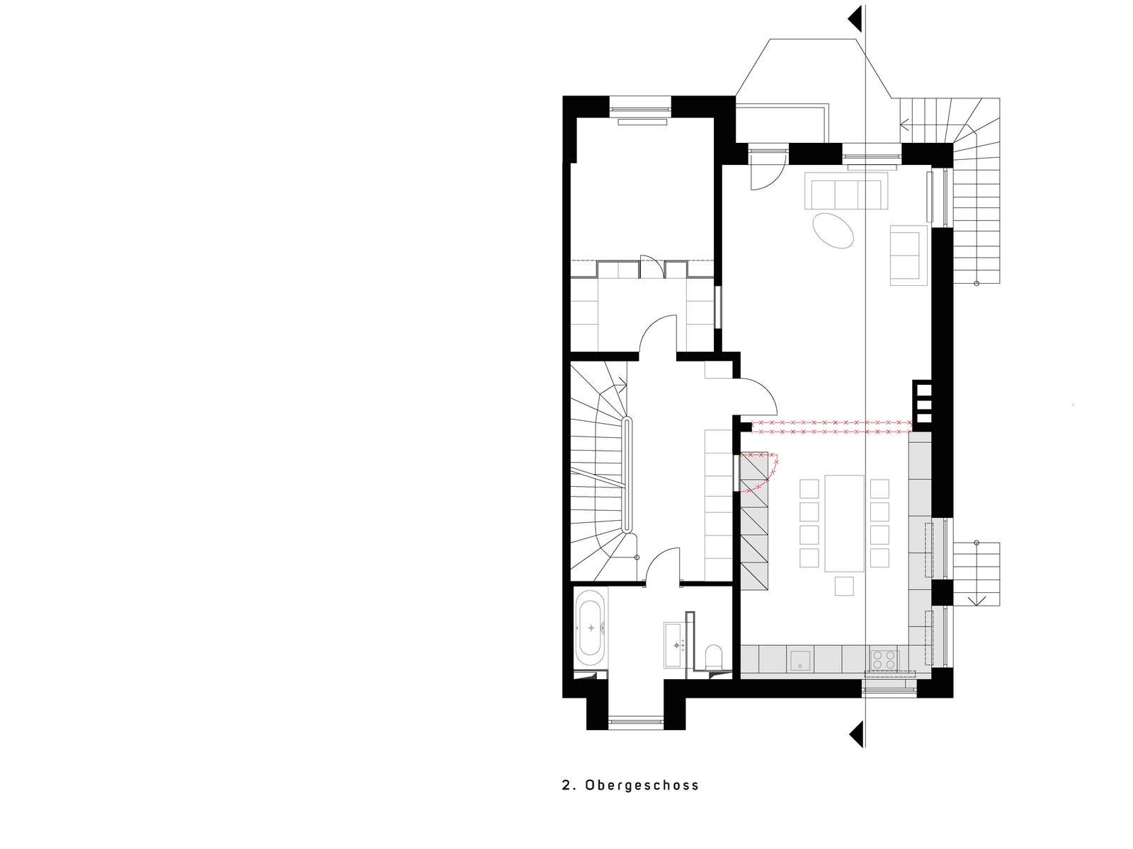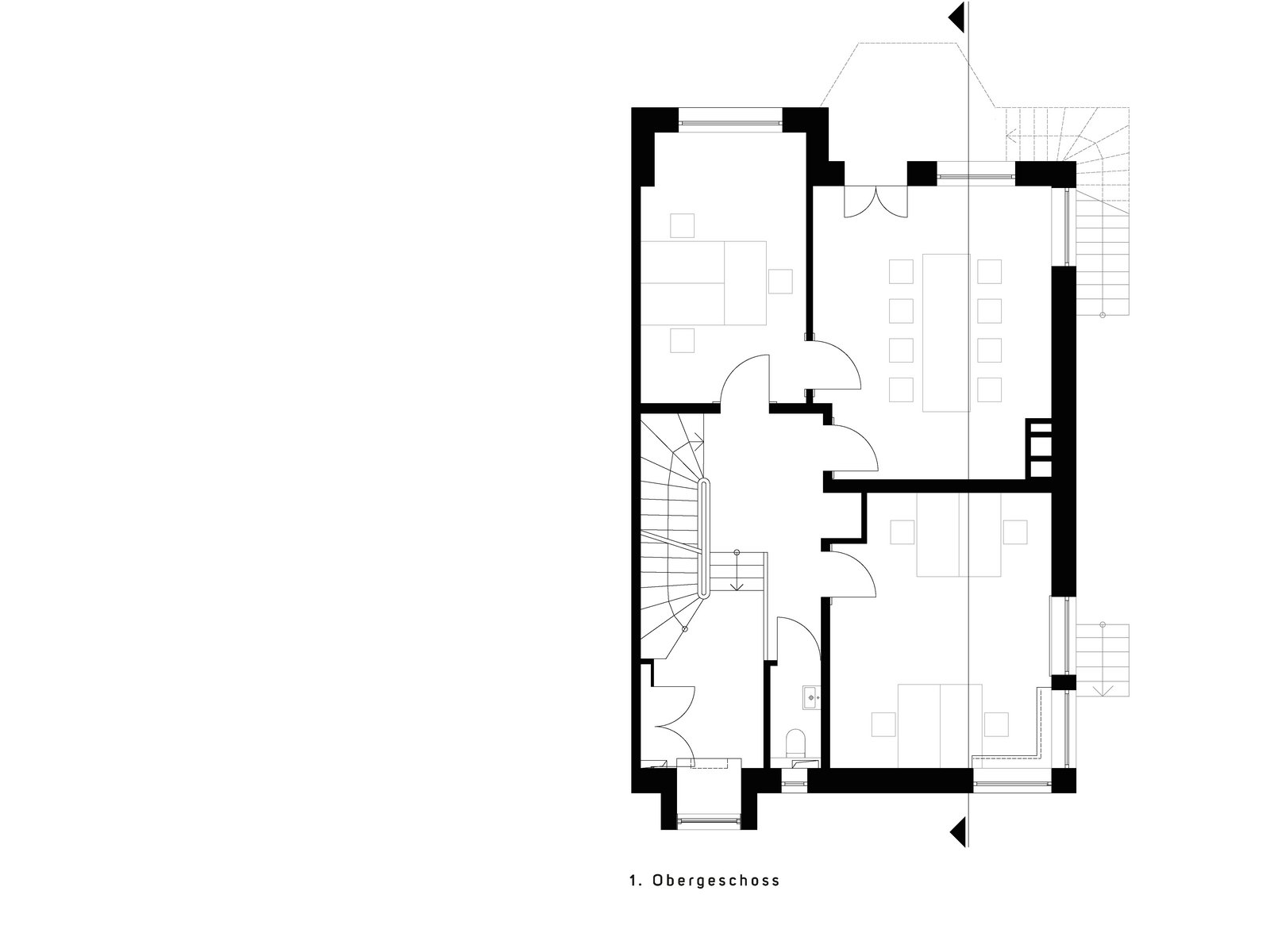 Die Gesellschaft ändert sich, und das verlangt auch neue Ideen in der Architektur, sowohl im Zusammenleben als auch im Zusammenarbeiten in der Stadt. In dem großbürgerlichen 380m² großen Reiheneckhaus aus den 20iger Jahren wurden die ehemaligen Bedienstetenzimmer einschließlich deren Arbeitsräume (Küche, Bügelzimmer und Waschküche) und das Hochparterre einer zeitgemäßen Nutzung geöffnet werden. Wie auch früher, soll in dem Haus gewohnt und gearbeitet werden, jedoch unter der Maßgabe, dass die Bewohner dort selbst ihren Lebensunterhalt verdienen bzw. einen Beitrag zum Stadtleben in unsere Gesellschaft leisten und dort einen kreativen, lebendigen Stadtbaustein schaffen.