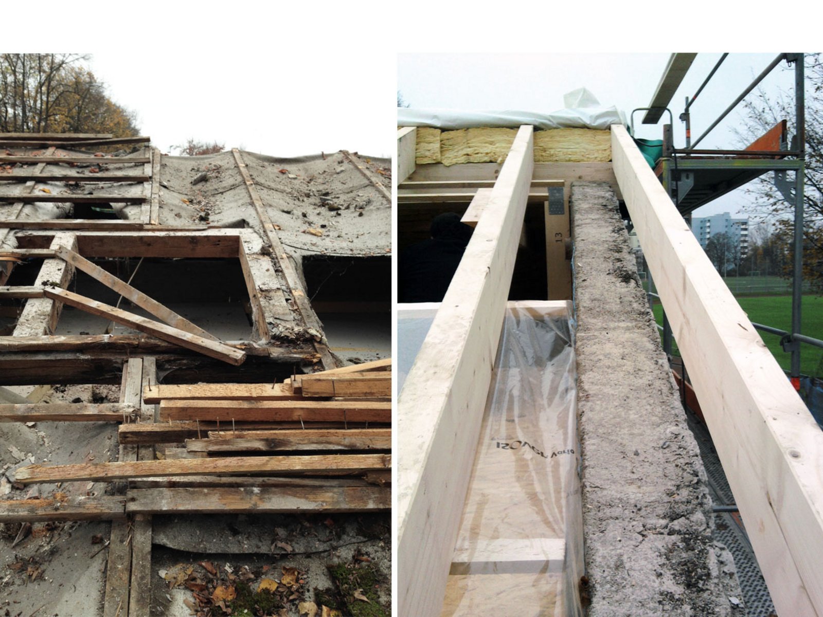 Das Dach und die Wärmedämmung auf der Decke der Hausmeisterwohnung wird vollständig erneuert, die Dachkonstruktion über dem Betriebsgebäude kann erhalten werden, die unzureichende Wärmedämmung auf der Decke wird erneuert.