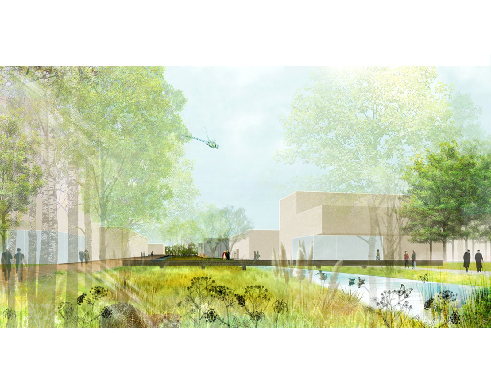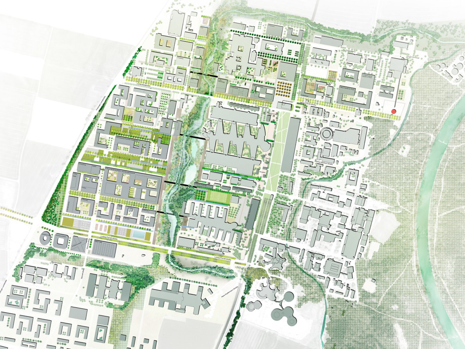 Die bestehenden Freiräume entlang des Garchinger Mühlbachs und des Wiesäckerbachs werden zu einer Zone mit erhöhtem Biotopwert weiterentwickelt, die das Campusareal durchzieht. Diese Grünen Spange formt das Rückgrat der Science City und schafft Verbindungen entlang der Wasserläufe zur den Isarauen als auch nach Garching. Eine Folge von Stegen und Plattformen entlang der Grünen Spange schafft einen klaren Übergang zwischen Gebäuden und Freiraum.