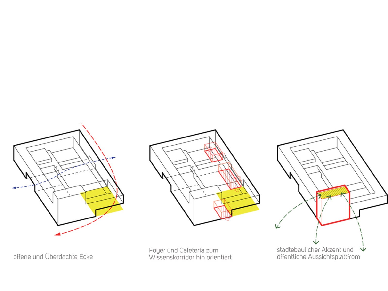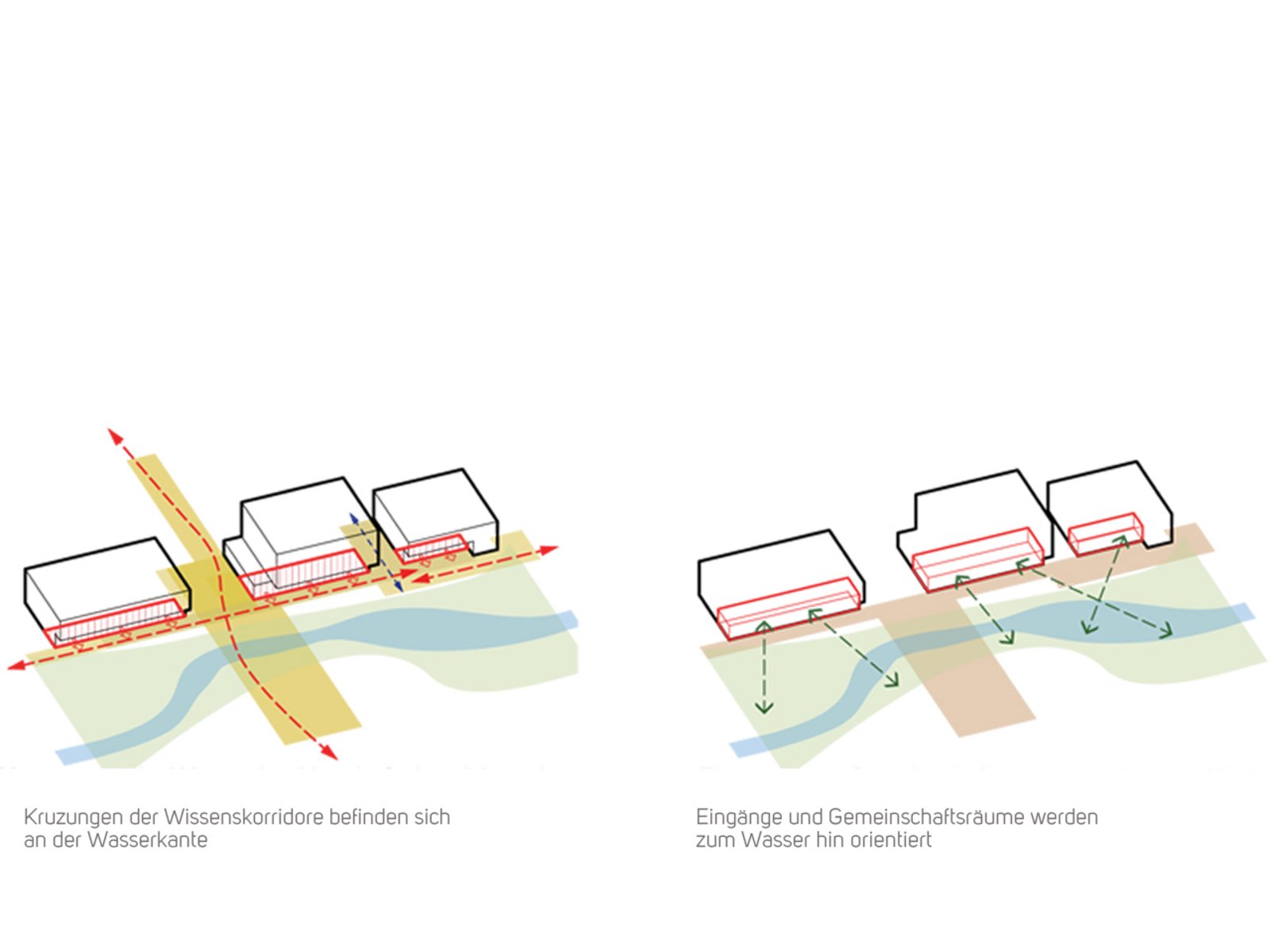 Ost-West-Routen entlang der Wissenskorridore schaffen neue Verbindungen, die eng mit der Freiraumstruktur des Campus verwoben sind. Grüne Finger strukturieren dabei die Bauformen in Verbindung mit einem intensivierten Freiraumprogramm. Verbesserte Freizeit- und Erholungseinrichtungen finden hier ebenso ihren Platz wie innovative Freiraumnutzungen wie z.B. Gemeinschaftsgärten. Mittels Stegen über die Grüne Spange hinweg werden die Grünen Finger mit den Bestandsgebäuden verbunden.