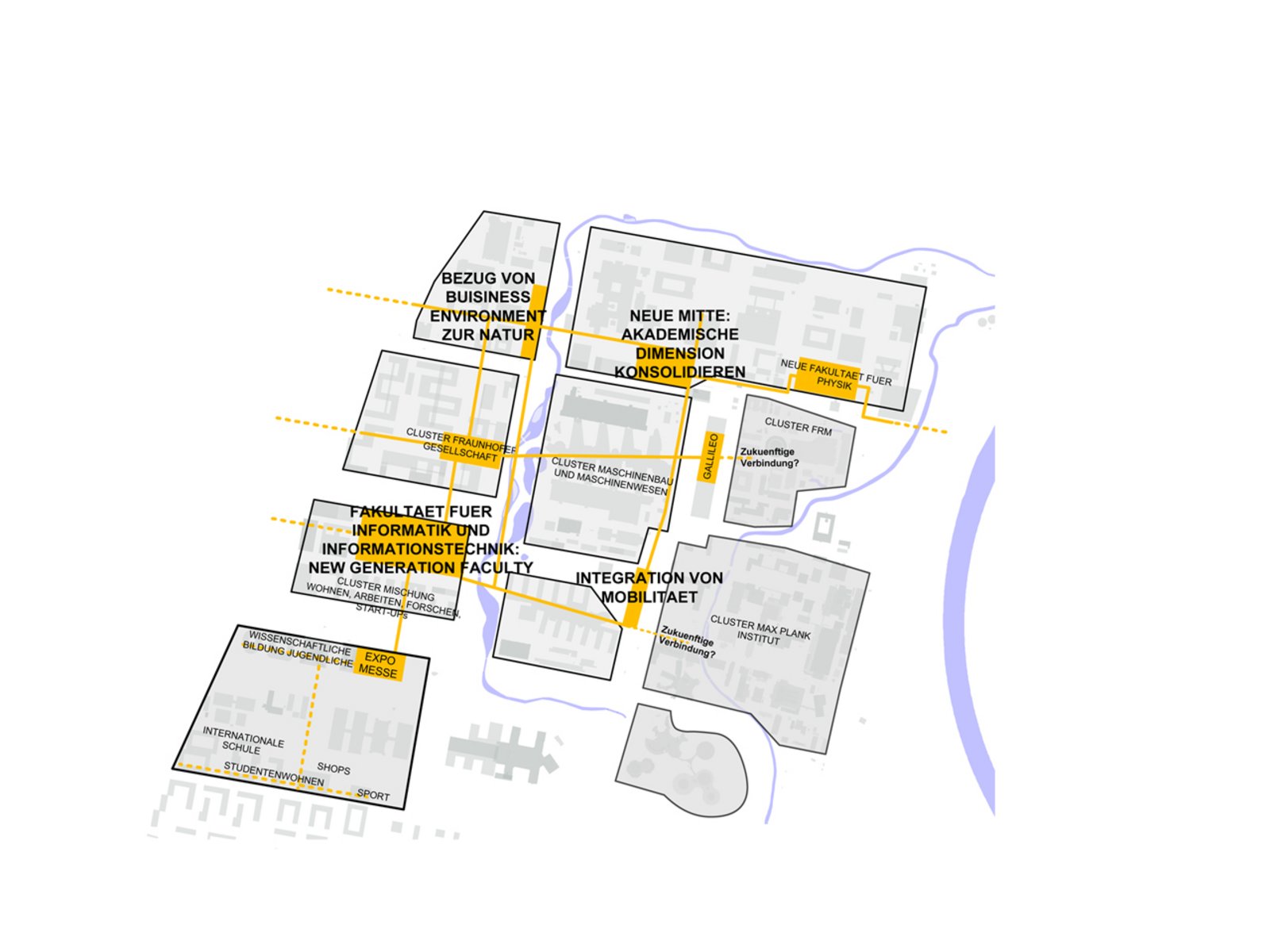 Diesem Projekt legen wir die Hypothese zugrunde, dass die zukünftige Erweiterung der U-Bahn in Richtung Flughafen tiefgreifende und umwälzende Auswirkungen auf die Stadt Garching und ihren Forschungscampus haben wird. Sobald diese Annahme zur Realität wird, ist es nicht nur die Frage wie sich der Campus über seine aktuellen Grenzen hinaus weiterentwickelt, sondern auch, wie sich die Stadt Garching selbst anpassen und auf den neuen, unvorhergesehenen Entwicklungsdruck positiv reagieren kann.