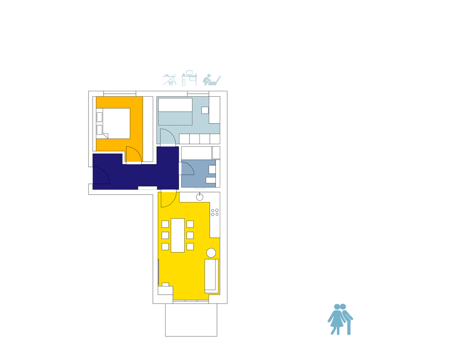 Durch das Verlegen der Küche entsteht ein Raum zum gemeinschaftlichen Essen und Wohnen, sowie zwei Arbeitszimmer. Eines davon dient unter anderem als Multifunktionsraum, der für das Beherbergen von Gästen oder als Hauswirtschaftsraum genutzt werden kann – konzentriertes Arbeiten gefolgt vom gemeinsamen Feierabend.