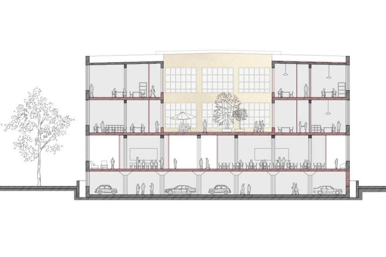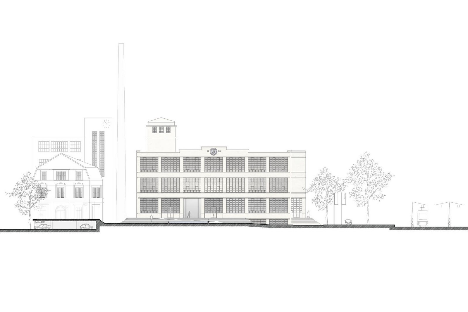 Die prägenden Volumina der Produktionsgebäude werden erhalten. Da eine wirtschaftliche Instandsetzung des Tragwerks nicht mehr möglich ist, wird das Gebäude entkernt und neu von der Fassade entkoppelt wiederaufgebaut. Die alte Tragstruktur mit den z.T. achteckigen Stützen wird wiederaufgebaut und soll das Gebäude im Inneren prägen. Anbauten und Aufbauten werden entfernt, die ursprünglichen Gebäudekomplexe erhalten. Die Fassadenteilung/ -struktur wird erneuert in Art des Bestandes. Das Gebäude erhält eine innere thermische Hülle mit hinterlüftetem Kastenfenster und Sonnenschutz im Kastenfenster. Das äußere Kastenfenster wird in seinem Erscheinungsbild rekonstruiert.