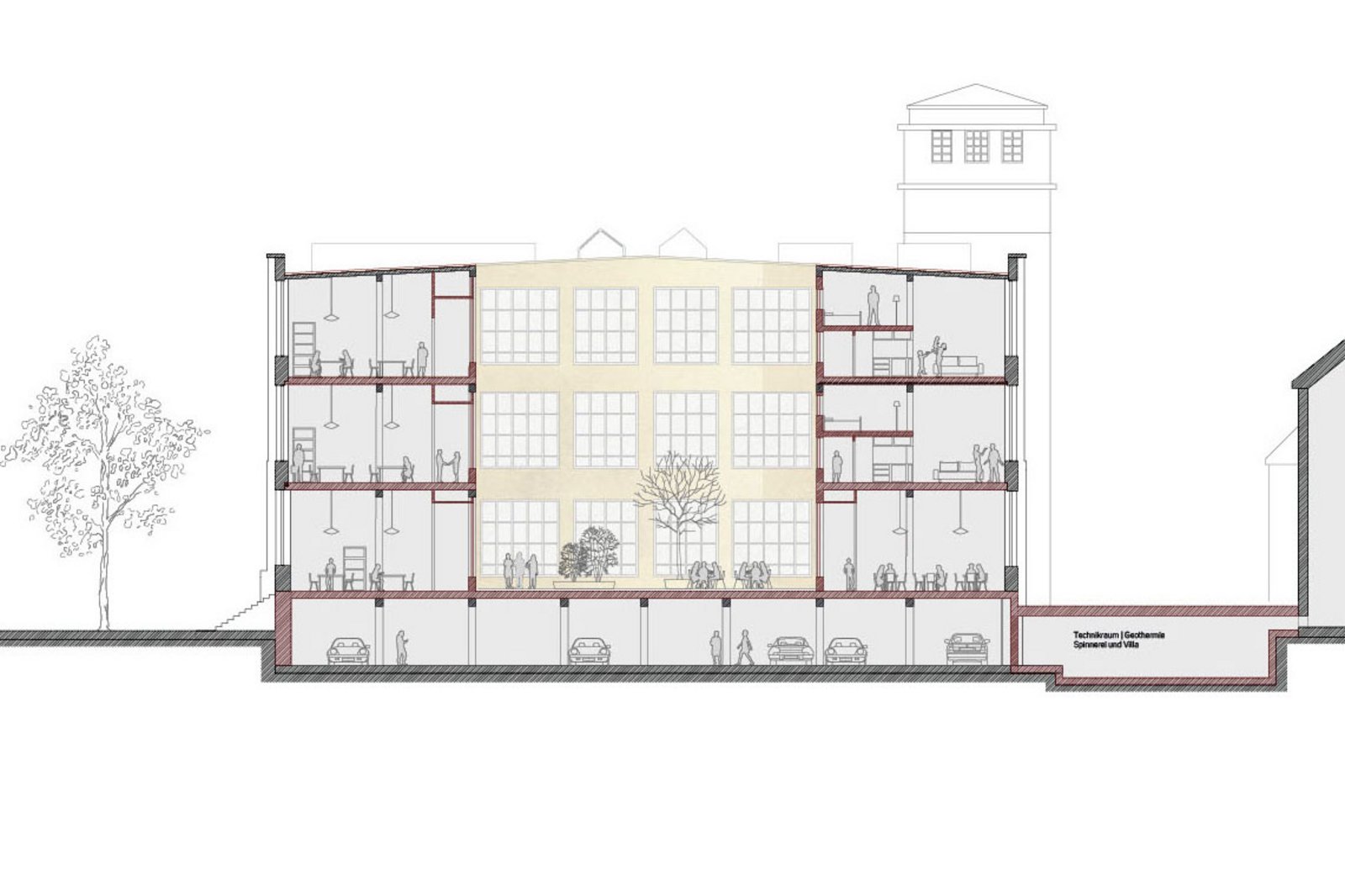 Die Wohnungen werden im südlichen mittleren Teil der alten Spinnerei realisiert, mit einem eigenen Treppenhaus übereinander und mit einer Fassade zur Straße /Gasse gegenüber der Villa. Die kleinen Wohnungen auch über die Passage erschlossen können sowohl von Mitarbeitern der Verwaltung als auch extern vermietet werden. Anstatt einer privilegierten Wohnnutzung auf dem Dach werden die Wohnungen zur Gasse zwischen Villa und alter Spinnerei hin orientiert. Der Straßenraum wird aufgewertet und bringt Leben auch sonntags in das Quartier. Die Lage ist dem Bahn- Verkehrslärm abgewandt und ruhig.