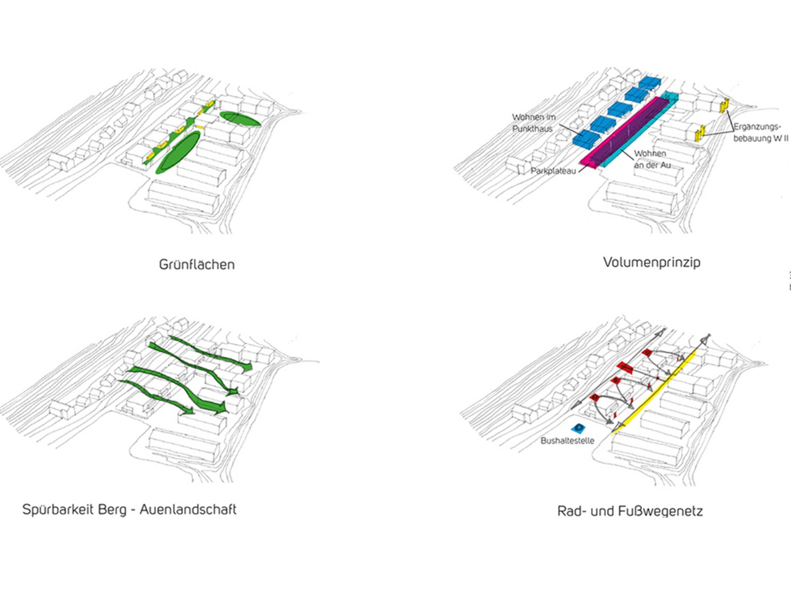 An der topographischen Nahtstelle zwischen Münchner Schotterebene und tertiärem Hügelland entsteht die neue Studentenwohnanlage. Die Konzentration aller Funktionen (Parken und Wohnen) an der Straße ermöglicht große Freiräume im Innern des Grundstücks: die Auenlandschaft wird wieder erlebbar – Wiesen, Rasenflächen und Weiden reichen bis an die Südfassaden heran. Idealerweise könnte in einem späteren Bauabschnitt die Parkebene unter Weihenstephan IV in Apartments umgewandelt werden und die Fahrgassen dem Auen-Freiraum zurückgegeben werden. Das neue Wohnheim fasst die bestehenden Einzelgebäude zu einem Campus zusammen. Nach Norden und Süden bildet der Gebäuderiegel klare Kanten aus, die durch Einschnitte, bepflanzte Höfe und Durchgänge eine Durchlässigkeit bekommen. Die Differenzierung der Baukörper vermittelt zwischen den kleinteiligen Wohngebäuden im Norden und der Großform des Fraunhofer Instituts.