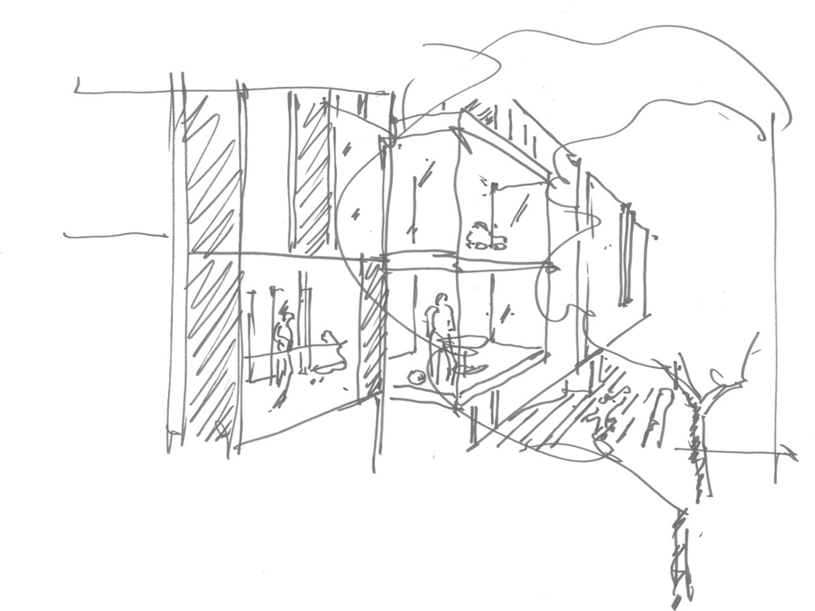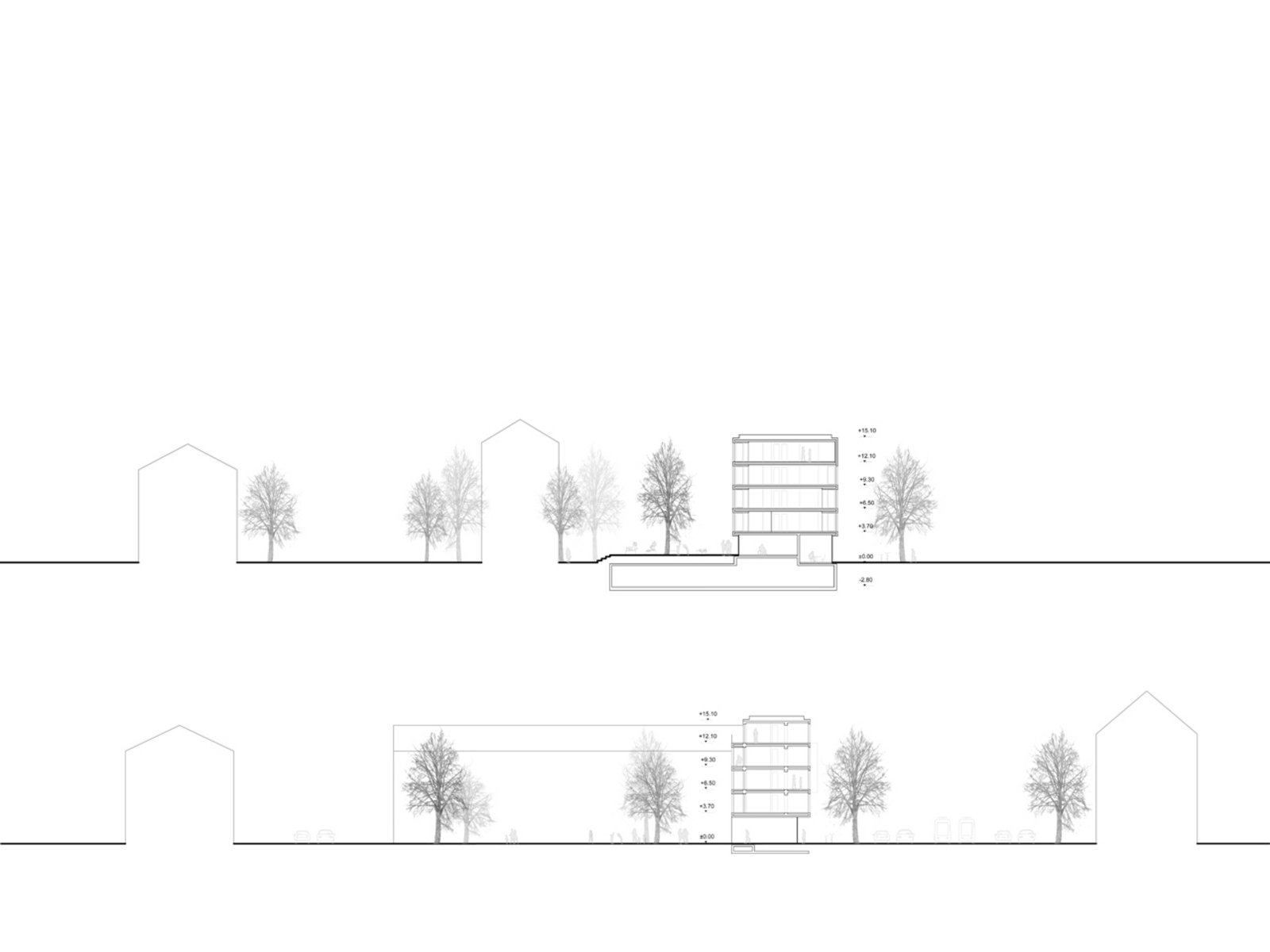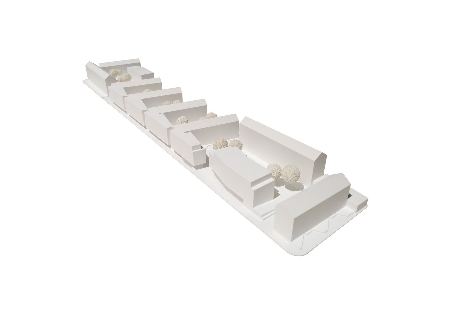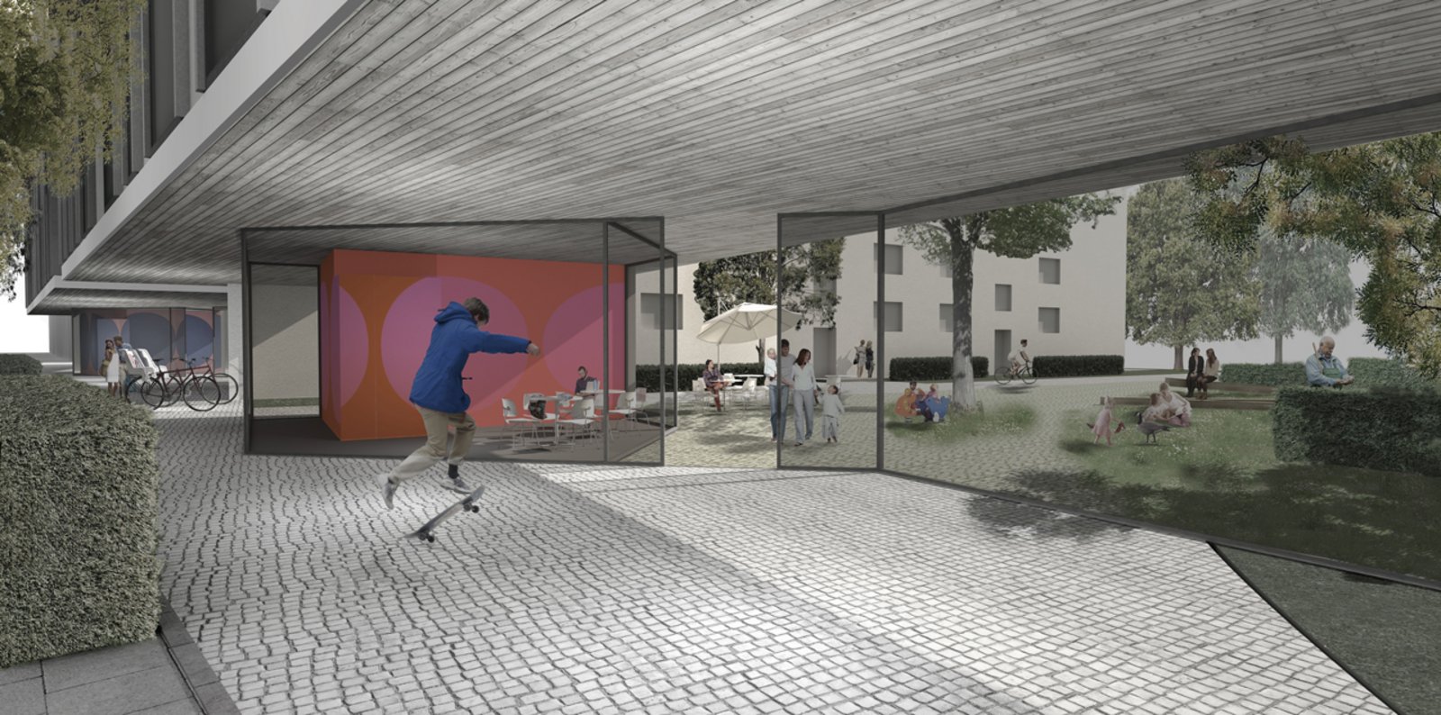 Die Erdgeschosszone des Hauses B bildet je einen individuellen Zugang zwischen den Bestandsgebäuden als skulpturales Element. Zusammen mit dem Gemeinschaftsraum artikuliert es den Freiraum mit den darüber liegenden „Auszubildendenwohnungen“. Eine zur Gebäudekante zurückversetzte fließende Glaswand fasst den Raum unter den Häusern und schließt die Schallschutzfunktion. Die Innenhöfe zwischen den Querriegeln sind so vor dem Lärm der vielbefahrenen Dachauer Straße geschützt, Durchblicke sind weiterhin möglich und die Spürbarkeit der Tiefe des Quartiers bleibt erhalten. Die Lindenallee begleitende Bestandshecke wird unterbrochen, um so zwischen Gebäude- und Straßenkante eine erweiterte Gehwegzone zu formulieren. Der Fußgänger kann beobachten und beobachtet werden. So wird eine soziale und ein Gefühl von Sicherheit vermittelnde Kontrolle hergestellt.