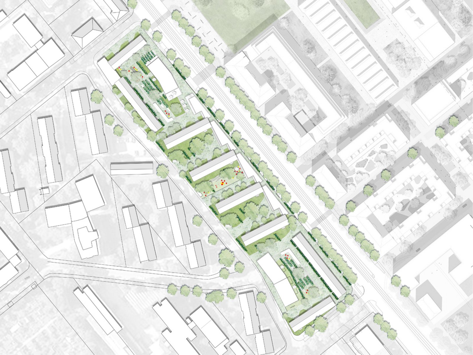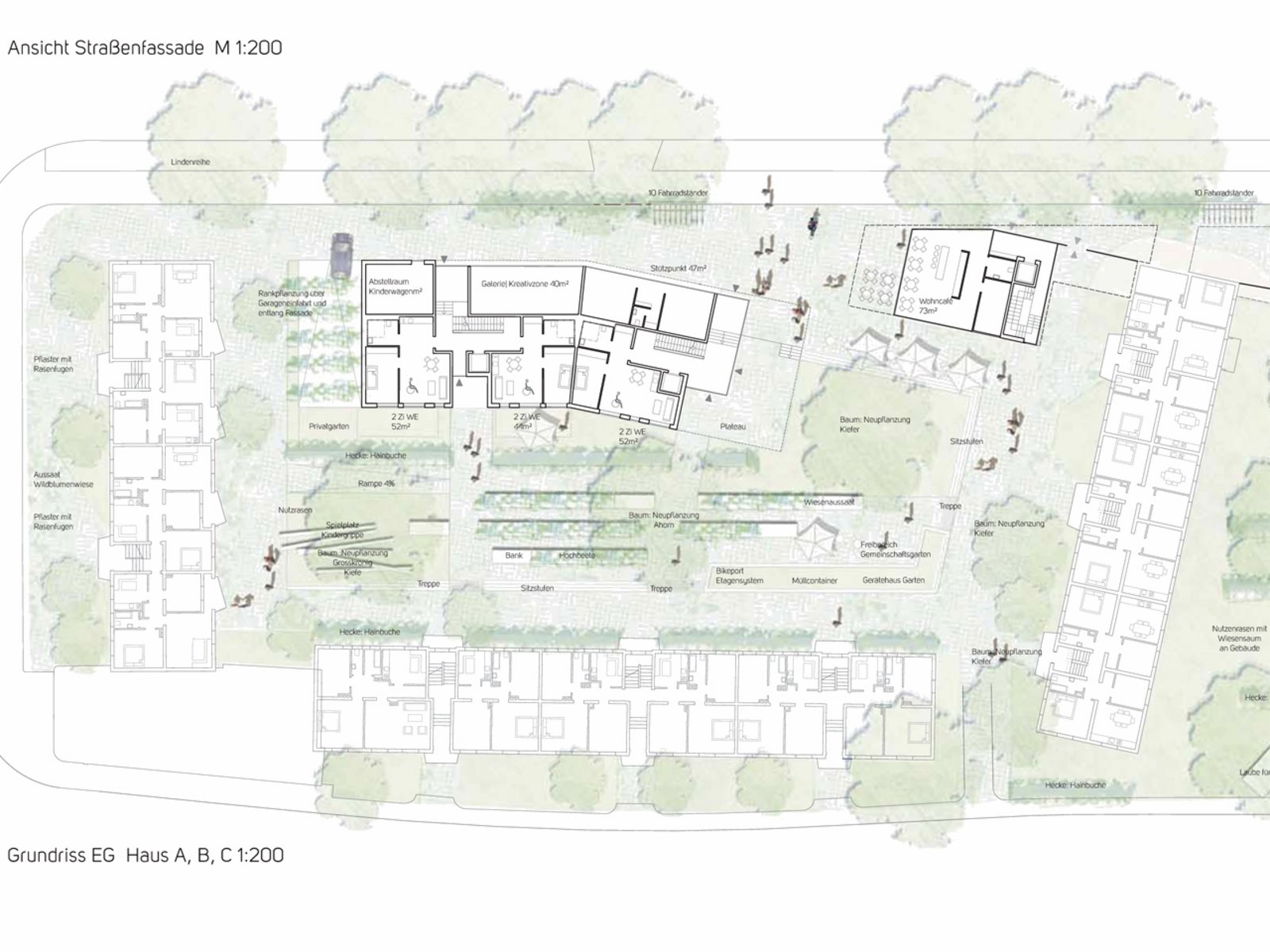 Die Anordnung des Bewohnercafés am Eingang zum Quartier schafft einen herausgehobenen und attraktiven Ort für Veranstaltungen mit öffentlichem Charakter, wie Bewohnerfeste oder Vorträge. Partizipatorische bzw. gemeinschaftliche Nutzungsangebote sollen die Voraussetzungen für eine gute Nachbarschaft und eine Bindung der Bewohner an ihr Quartier bieten. Die erhöhten Gartenplateaus über der Tiefgargage ermöglichen die notwendige Privatheit zum öffentlichen Raum und ermöglichen die Neupflanzung von einigen identitätsstiftenden, großkronigen Bäumen. Überdies wird auf dem Dach von Haus A eine Dachterrasse angeboten, die für alle Arten gemeinschaftlichen Zusammenseins genutzt werden kann.