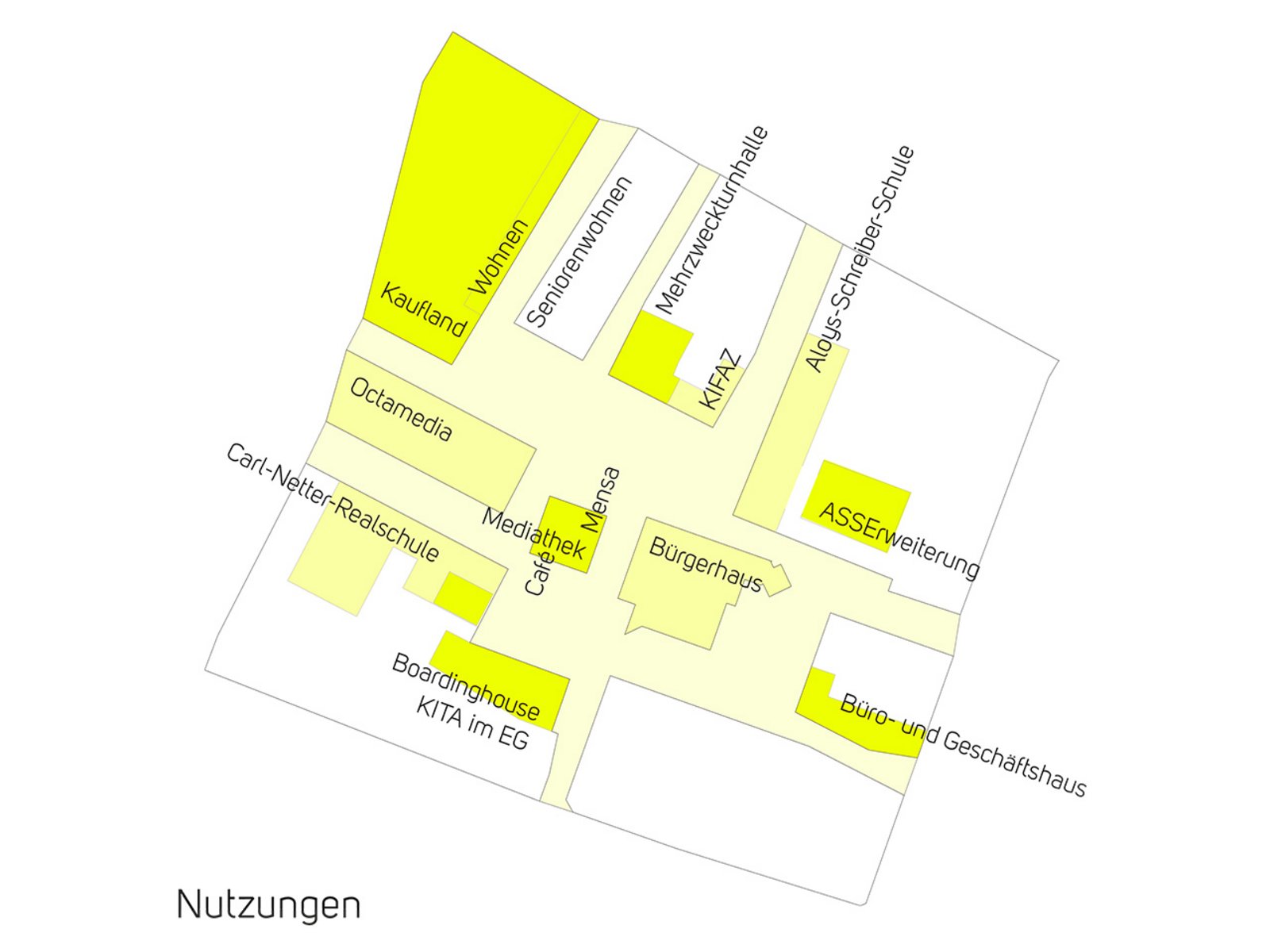 Die bestehende Mediathek wird ergänzt um Mensa und Schülercafé, genau in der Mitte des Spannungsfeldes der beiden Schulen bietet dies die Chance das Herz des Bildungs- und Kulturcampus zu werden. Gegenüberliegend zum bestehenden Eingang wird ein zusätzlicher Zugang situiert, das Erdgeschoss wird so zur Bewegungszone und Teil des umfließenden Außenraumes, dem Campusplatz. Die Mensa und das Schülercafé in das Mediatheksgebäude zu setzen, schafft ein lebendiges Miteinander von Lernen und Leben. Niederschwellig wird der Umgang mit Büchern in den Alltag integriert und der Austausch zwischen den verschiedenen Einrichtungen auf dem Campus gestärkt. Die Mensa, das Café und die Mediathek können unabhängig voneinander genutzt werden, bündeln aber auch Synergien wie z.B. die gemeinsame Nutzung der Küche und Sanitäreinrichtungen. Außenbereiche für das Schülercafé und die Mensa sollen einen „Biergartenflair“ in den Sommer- und Übergangszeiten ermöglichen.