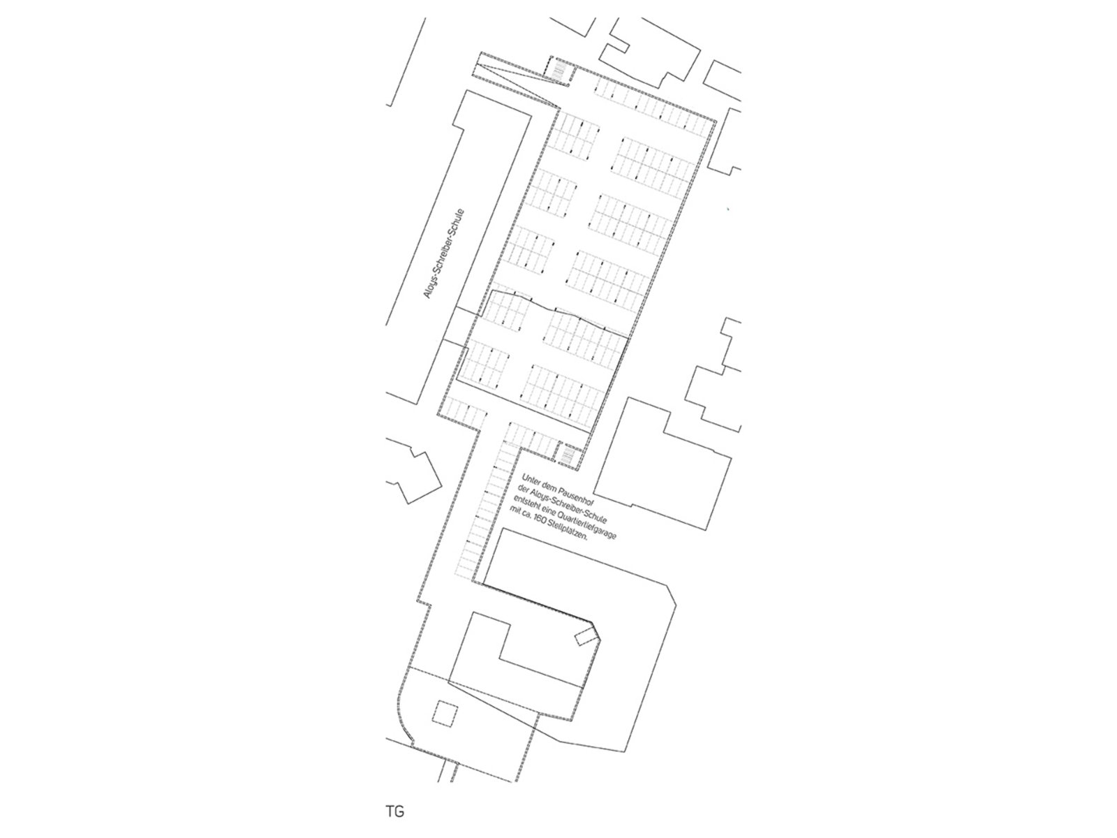 Die bestehende Tiefgarage der Stadtsparkasse wird mit der unter dem Grundschulpausenhof situierten neuen Tiefgarage, mit zusätzlichen ca. 160 Stellplätzen verbunden und über eine Tiefgaragenrampe in der Elisabethstraße erschlossen