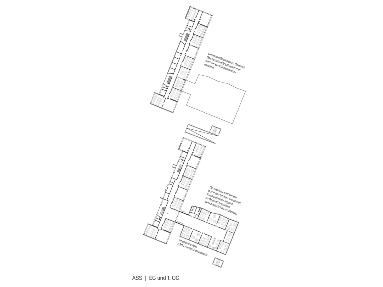 Der eingeschossige Erweiterungsbau der Grundschule wird etwas zum Profil der Marktstraße zurückversetzt und so ein eigener Vorbereich geschaffen. Der Neubau bildet klare räumliche Kanten nach Innen und Außen aus.