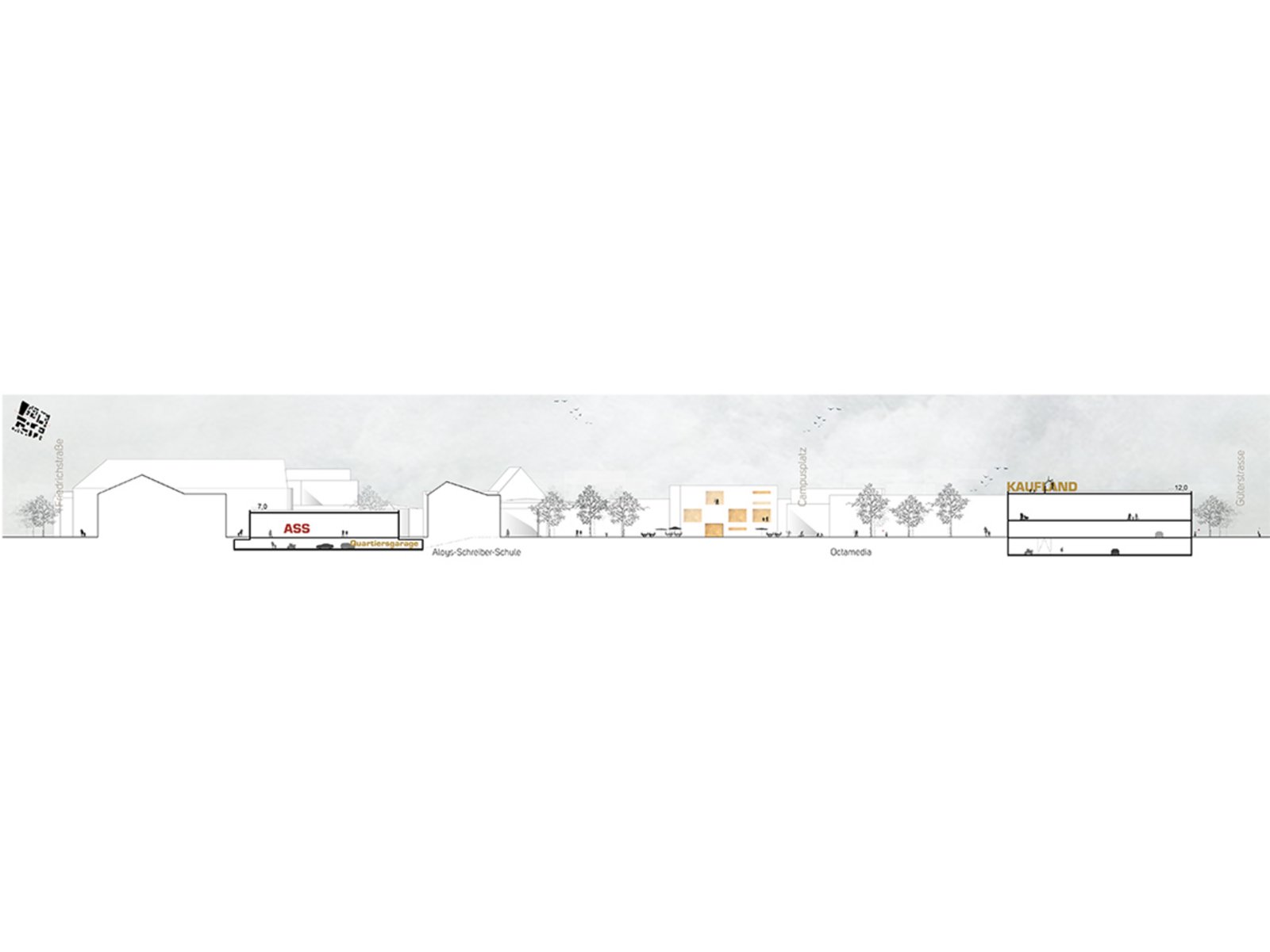 Im Nordosten entsteht ein Einkaufszentrum mit einer Freiraumpassage zwischen Octomedia und dem neuen Supermarkt. Die sich gegenüberliegenden, bestehenden und neuen, Vorverkaufszonen bieten die Möglichkeit den Einkauf als Ereignis zu inszenieren. Die ursprünglich dort situierten Parkplätze werden in einer gemeinsamen Tiefgarage, mit insgesamt ca. 350 Stellplätzen, gebündelt. Den beiden Geschäftshäusern kann je eine eigene Adresse, Zufahrt Octomedia und Zufahrt Kaufland, generiert werden. Der Aufgang zu den Geschäften kann schon im Untergeschoss von einer attraktiven Vorverkaufszone begleitet werden. Von Autoverkehr ungestört können sich Kunden und Passanten, zwischen den sich ergänzenden Einkaufsläden, frei bewegen.