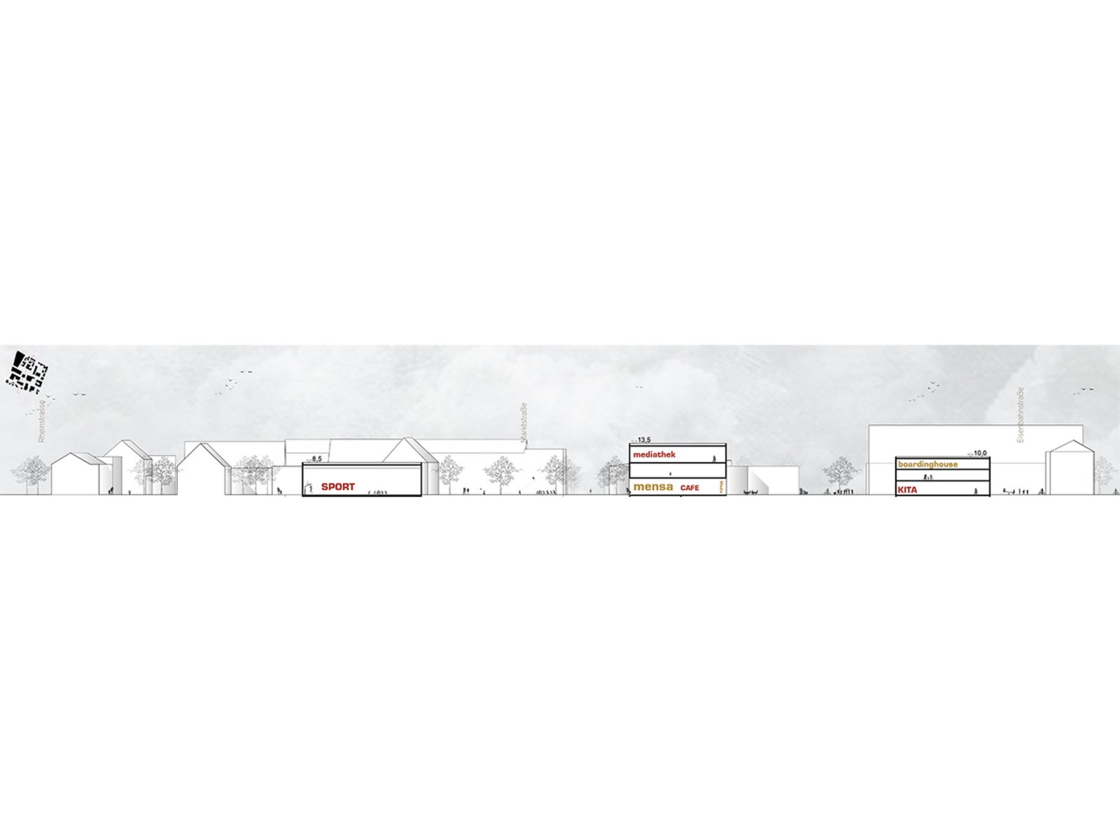 Die Sporthalle wird auf das freie Grundstück neben der KiFaz gesetzt, um den öffentlichen Charakter des Campusplatzes zu stärken und um die Sporthalle auch im Rahmen des Kinder- und Familienzentrums oder auch für Tanzveranstaltungen der Seniorenwohnanlage zur Verfügung zu stellen. Für die Grundschüler entsteht so ein großer geschützter Pausenhof (im Osten der bestehenden Grundschule). Auch die dort situierte Quartiersgarage kann damit effektiv und flexibel gestaltet werden