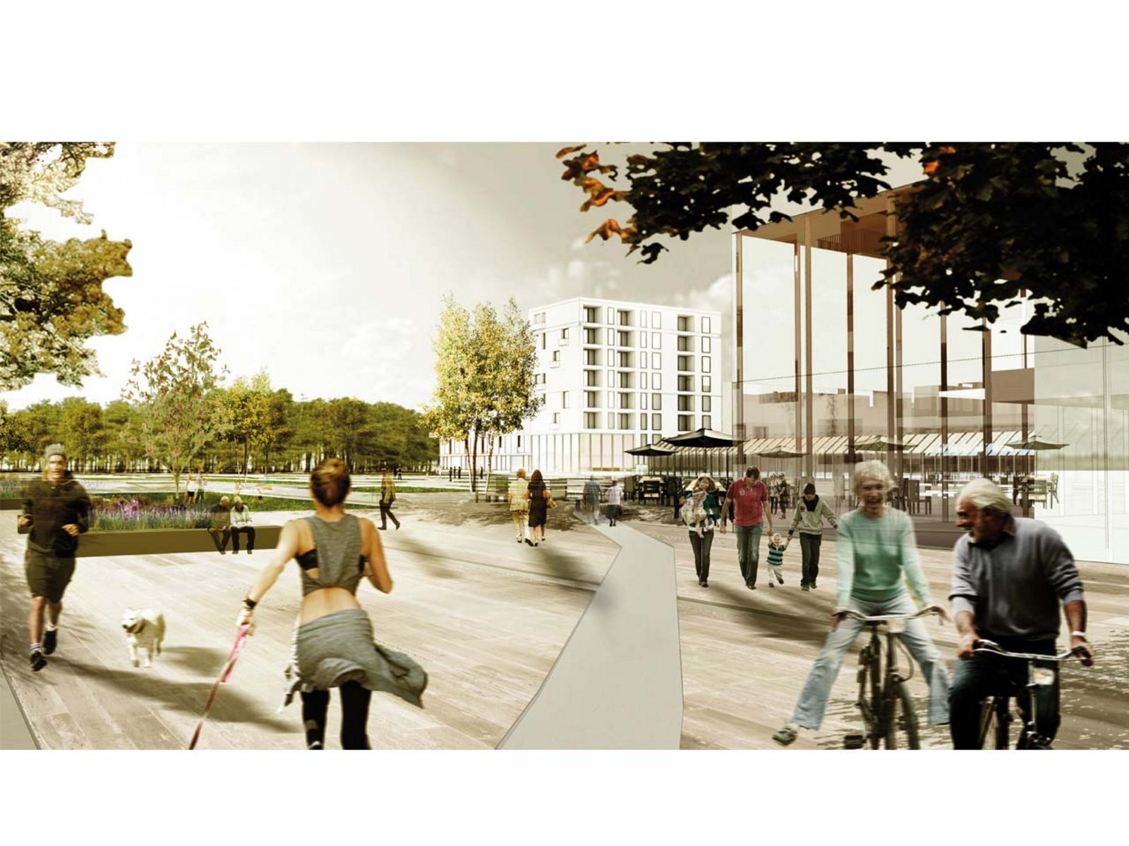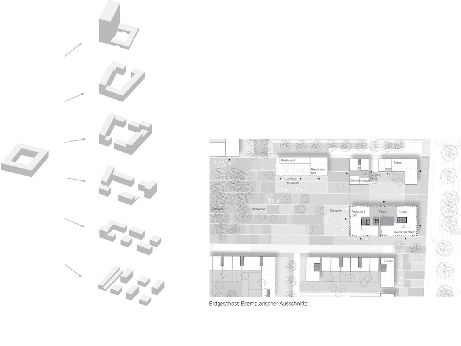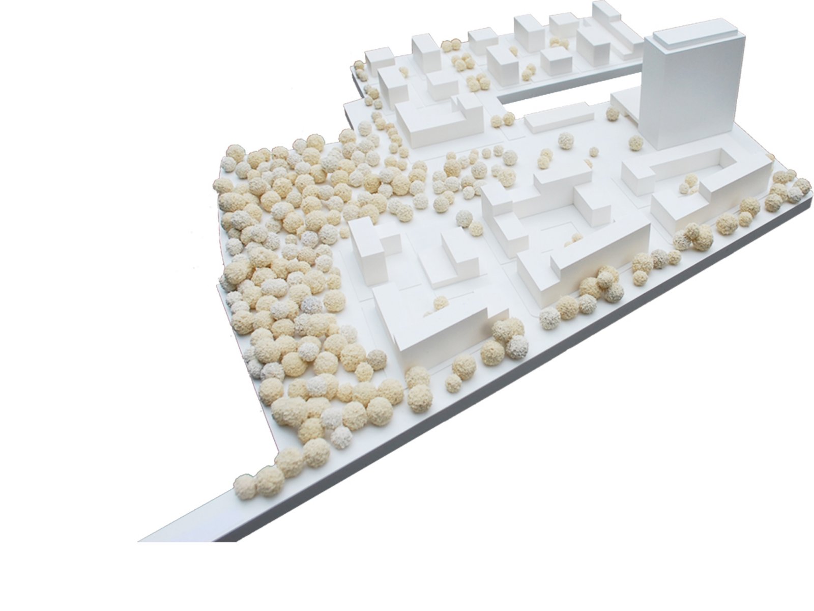 Wir schlagen für diesen Ort vor, Nachbarschaften zu bilden, die aus einer aufgelösten blockerinnernden Struktur bestehen, mit öffentlichen, halböffentlichen und privaten Räumen. Die Nachbarschaften werden in einer Dimension von 200- 300 Wohneinheiten gebildet. Sie bieten den Bewohnern eine gute Möglichkeit sich zu orientieren und eine Beziehung zu ihrem Wohnumfeld aufzubauen. Der erhaltene prächtige Baumbestand gibt den Nachbarschaften zusätzliche unverwechselbare Identitäten, wie z.B. der Kindergarten an den alten Bäumen. Die Gebäude sind in Höhenentwicklung und Öffnung zu den öffentlichen Räumen äußerst unterschiedlich gegliedert. Die Zäsuren in den Blockrändern sichern die „Luftigkeit“, eine gute Belichtung und vermeiden eine allzu intensive Beschallung der Wohnungen durch gemeinschaftliche Nutzungen im Innenhof. Die grünen Gassen sind mit ihren Bäumen, Hauseingängen und Spielflächen Treffpunkt und Begegnungszone der Bewohner in einer gelassenen halböffentlichen Atmosphäre.
