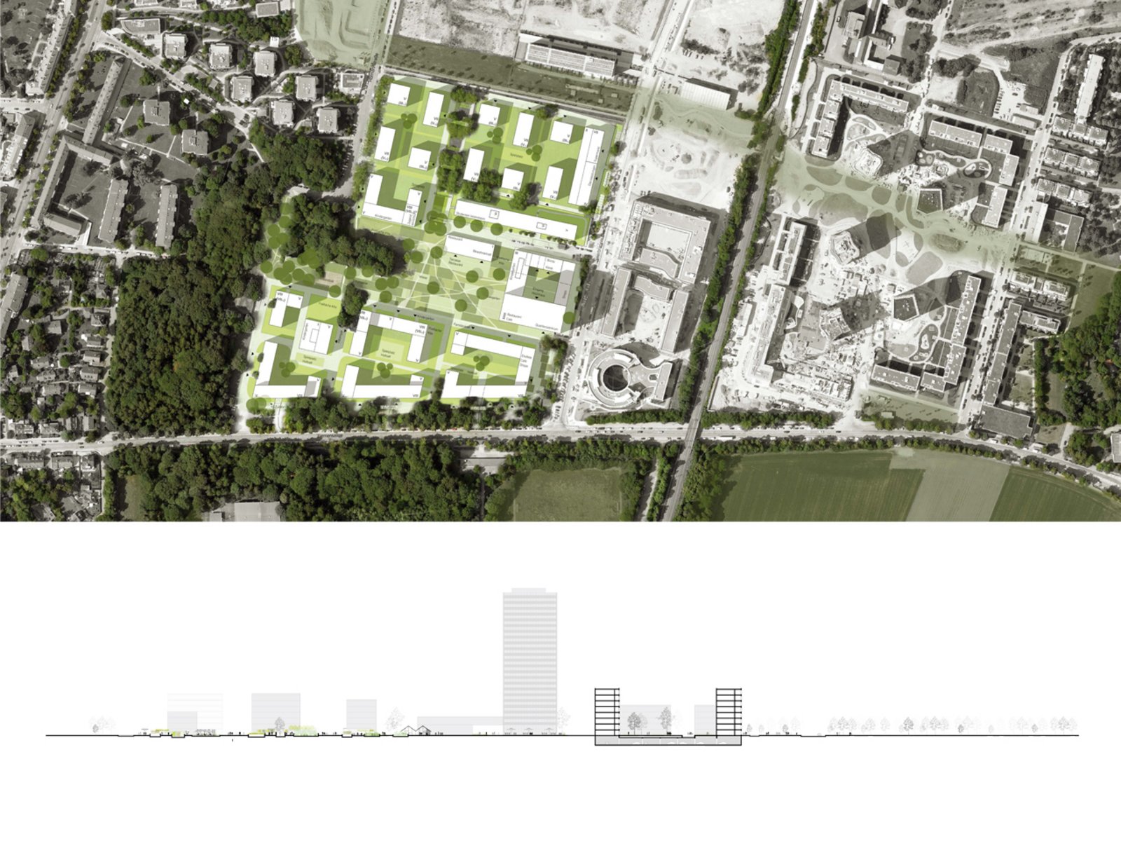 Das Wettbewerbsgebiet Campus Süd liegt im von Forschung und Dienstleistung geprägten Münchner Stadtteil Obersendling und soll jetzt ein neues Wohngebiet werden und sich so in das sich bereits verändernde Quartier einfügen. Die vorgefundene Eigenart des Ortes liegt in dem mächtigen Siemens Hochhaus, dem Studentenwohnheim, das sich in den Wettbewerbsumgriff spreizt, dem östlich der Baierbrunner Straße gelegenen Neubaugebiet mit seinen fünf Wohnhochhäusern und dem parkähnlichen Baum- und Wiesenbestand aus der Geschichte als weitläufiger Siemens Campus. Das baulich strukturell sehr heterogene Umfeld bietet aus dem Kontext keinen zwingenden Entwurfsansatz. Merkmal dieses städtebaulichen Entwurfs sind sechs Nachbarschaften um eine zentrale Mitte. Durch diese Wechselwirkungen entsteht eine gewisse räumliche Sinnlichkeit: ein harmonisches neues Wohnquartier Münchens, das auf folgenden Elementen basiert: Zugang und Adresse des Wohnviertels - Baierbrunner Straße Der urbane Charakter der Baierbrunner Straße wird gestärkt durch den großzügigen Lobbybereich um das Siemenshochhaus, das Café und die Eisdiele im Süden, sowie durch die weitere Einkaufsmöglichkeit im neuen Supermarkt im Norden des Wettbewerbsgebietes. In dem dreigeschossigen Lobbybereich befinden sich ein Restaurant, Café, Kiosk, Shops und das Quartierszentrum. Dienstleitungseinrichtungen wie z.B. eine Reinigung oder ein Fahrradverleih runden die Wohnbedürfnisse, nicht nur der Hochhausbewohner, sondern auch der umliegenden Anwohner ab. Diese städtische Atmosphäre um das Wohnhochhaus bildet gleichzeitig den Eingang und Adresse zum neuen Carré.