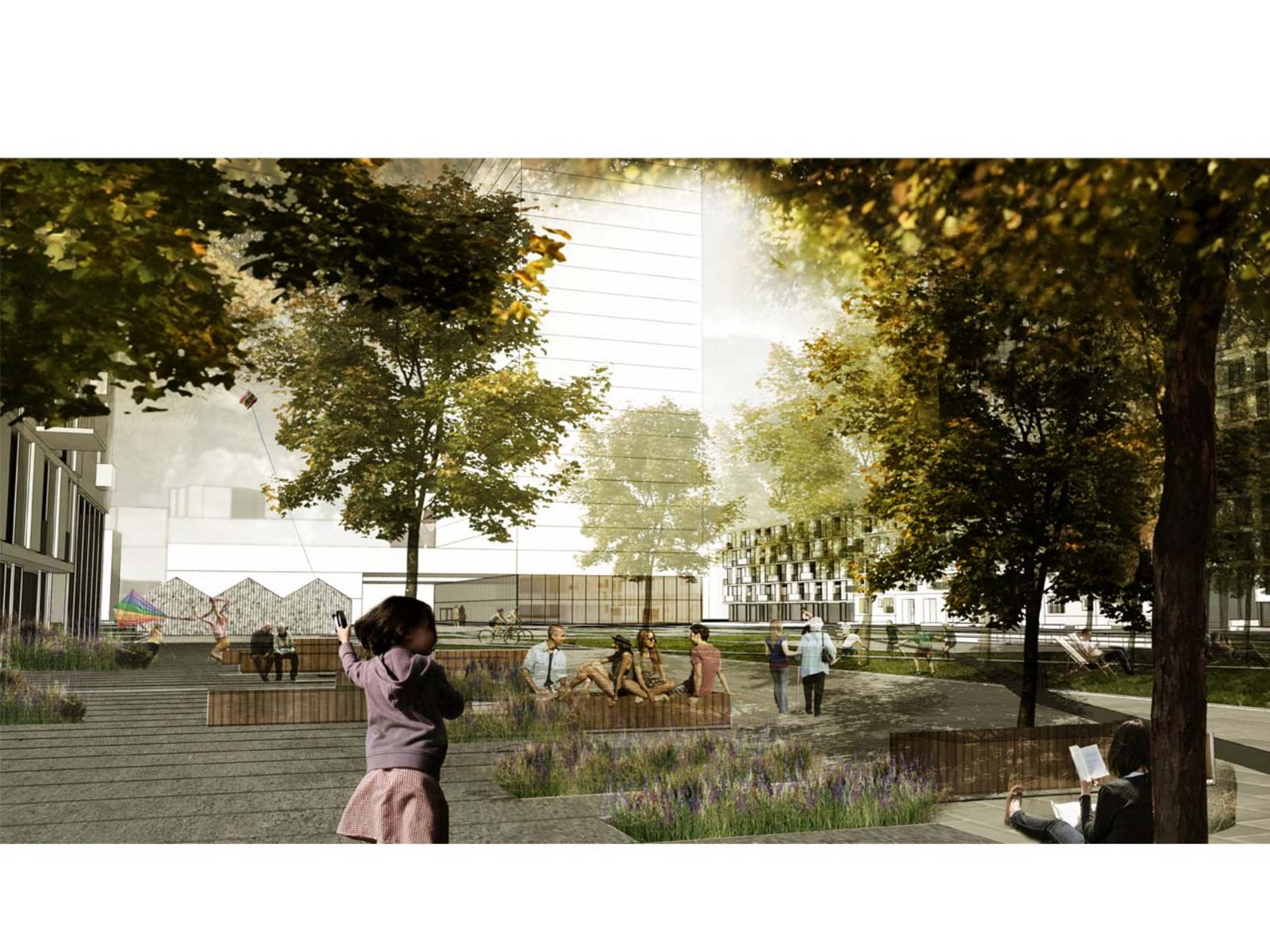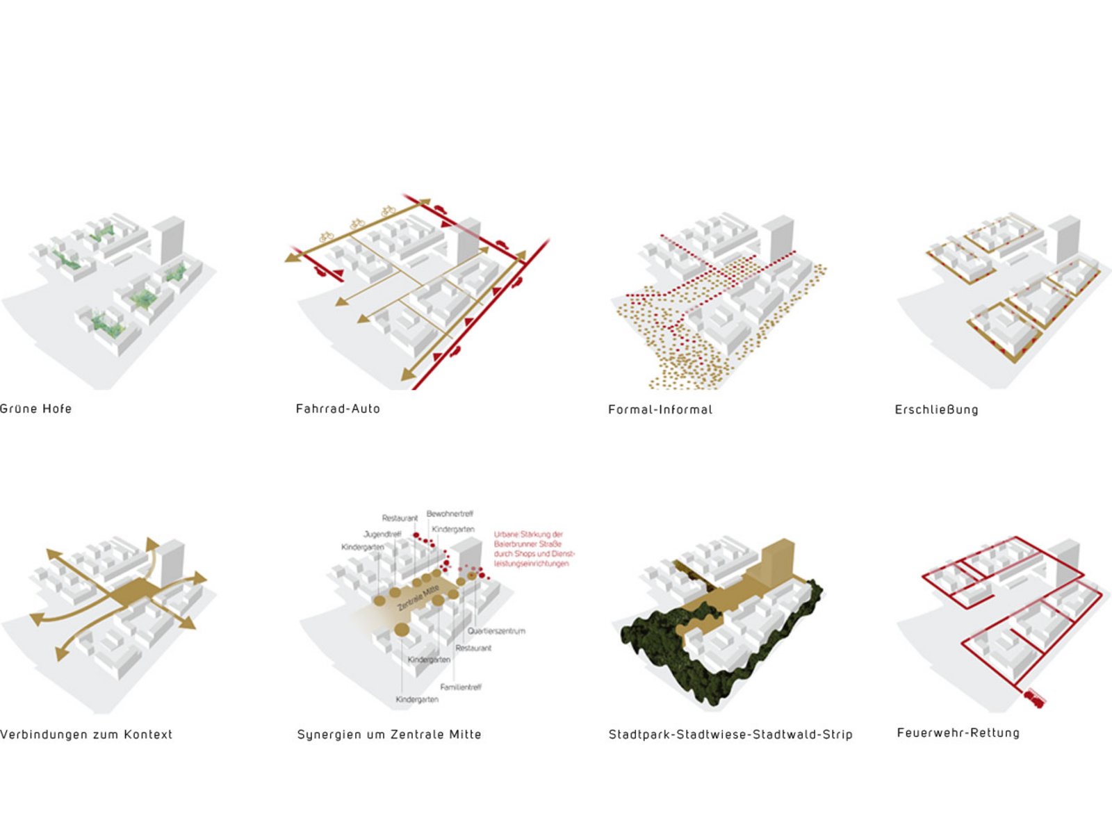 Stadtwiese – Das Quartiersentreé am Hochhaus geht über in eine Stadtwiese. Diese Stadtwiese bildet die zentrale Mitte des neuen Wohnquartiers. Die sozialen und kulturellen Nutzungen umspielen und bespielen diesen Raum, damit werden die privaten Innenhöfe der Wohnblöcke von intensiv genutzten öffentlichen Einrichtungen freigehalten. Die Gestaltung der Fläche, ähnlich der Grasfläche vor der Alten Pinakothek in München, wird durch spielerische und direkte Pfade für Fußgänger und Radfahrer durchzogen und verbinden die Nachbarschaften untereinander sowie mit der weiteren Umgebung. Stadtpark – In Richtung Westen hin geht die Stadtwiese fließend über in den Stadtpark mit den prächtigen Bestandsbäumen aus der Zeit der Nutzung als Siemens Campus. Dieser großzügige Park lädt die vielen neu zugezogenen jungen Familien ein, ortsnah mit ihren Kindern zu picknicken, zu spielen oder auch Sport zu treiben z.B. auf dem Basketballcourt. Lichtungen im Park bieten intimere Bereiche als auf der Wiese. Stadtwald – Der Stadtpark geht über in die wilde, weitestgehend naturbelassene Waldfläche. Dieses Biotop umfasst im Westen das Wettbewerbsgebiet und bettet das Wohngebiet im Süden zur Siemensallee ein. Weiter südlich erstreckt sich der Wald bis zum benachbarten Stadtteil Solln. Dieses weitläufig vernetzte Gebiet, direkt angeknüpft an die zentrale Mitte, bietet den Bewohnern eine gute Möglichkeit zum Spazieren und Erholen. Der Strip – Zwischen dem Radweg im Norden und der Zentralen Mitte stellt der Strip die Nord-Süd-Verbindung des Wettbewerbgebietes her. Dieses Band dient nicht nur als Fuß- und Radwegverbindung, sondern bietet auch die Möglichkeit für die Bewohner, sich beim urban gardening oder Bewirtschaftung eines Biomeilers kennenzulernen. Kindern können das Insektenhotel beobachten, sich als Imker betätigen oder einfach nur spielen. Binnengrünflächen in den Innenhöfen der „Nachbarschaften“ Die Grünflächen in den vielfältig gestalteten Wohnblöcken erhalten differenziert private, den Erdgeschosswohnungen zugeordnete Freiflächen. Individuelle Spielflächen und ein Hoftreff sind Bestandteil der Innenhofgestaltung.