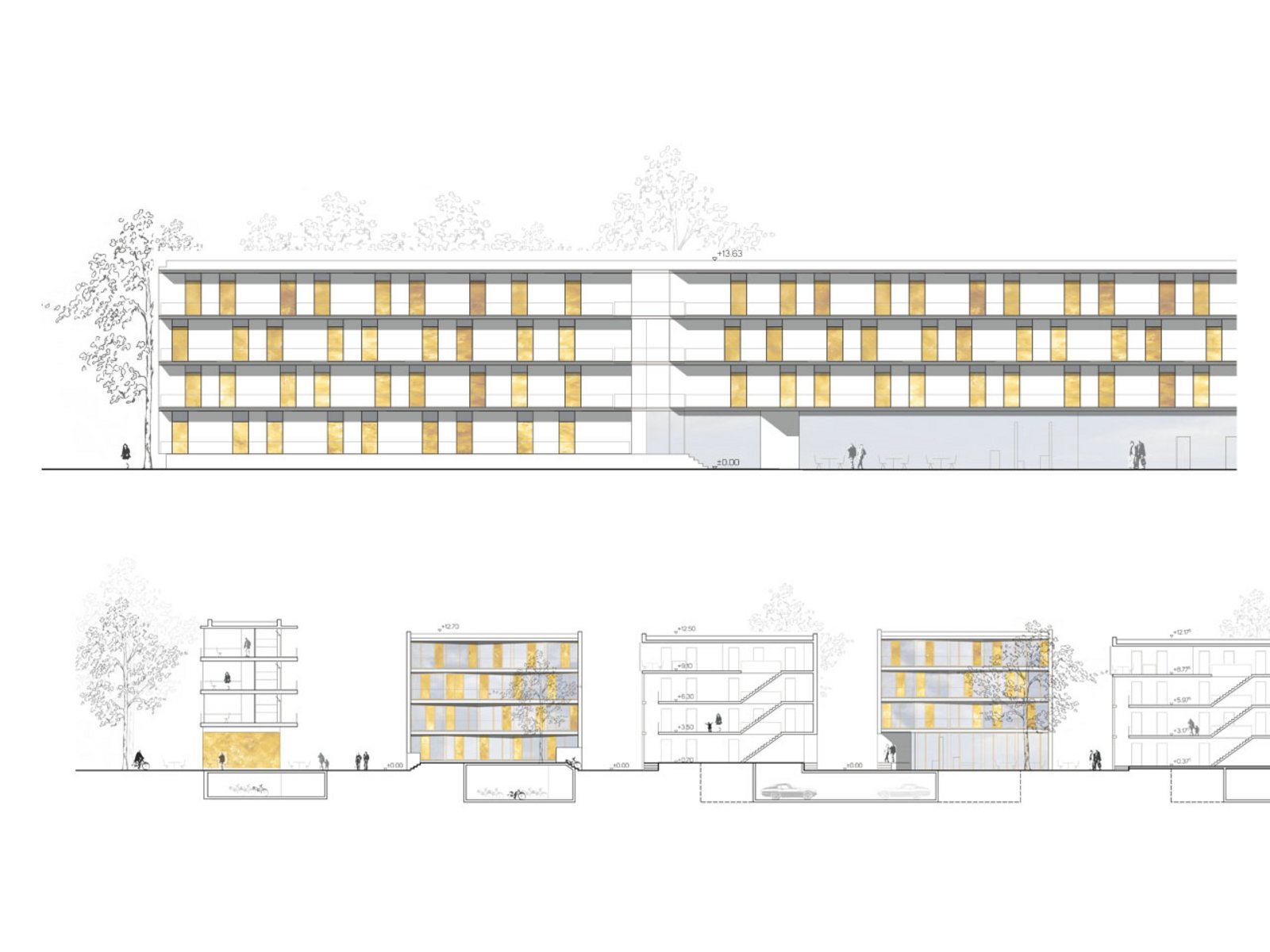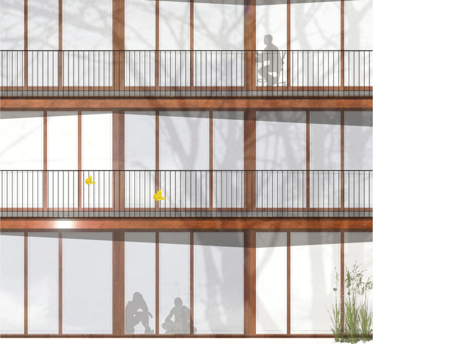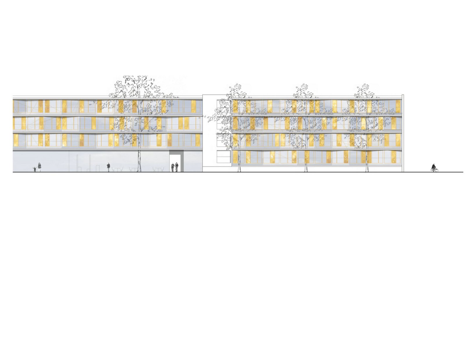 Die Studentenhäuser erhalten farbige, nach Studentenhäusern differenzierte Holz-Fensterelemente einschließlich Sturz und Leibungen aus Holzwerkstoff. Die Absturzsicherung ist als einfaches Stahlstabgeländer konzipiert und anthrazit gestrichen. Senkrechtmarkisen vor den Appartements der Studenten dienen als Sonnenschutz. Die Fassaden erhalten - soweit nötig - im südlichen Bereich Schallschutzelemente. An der Chiemgaustraße schlagen wir vor, die Holzoberfläche aufgrund der größeren Beanspruchung durch eine Aluschale zu ersetzen.