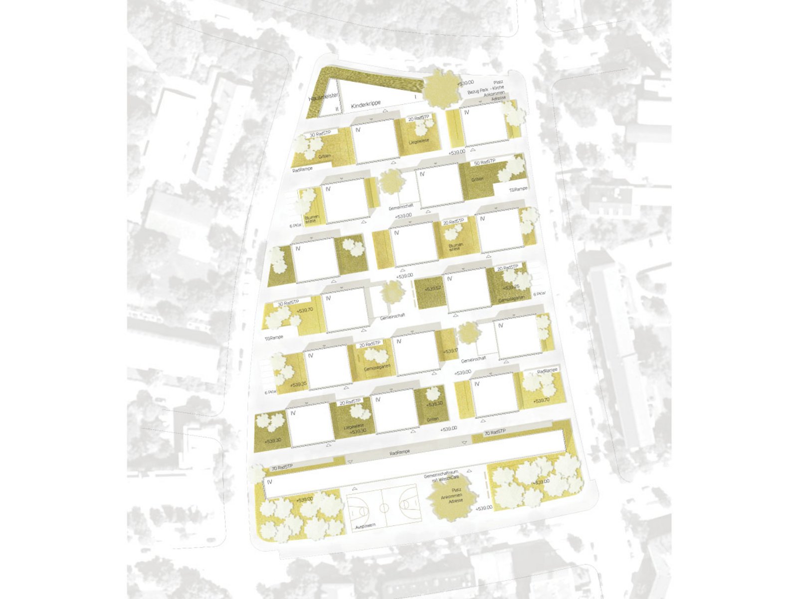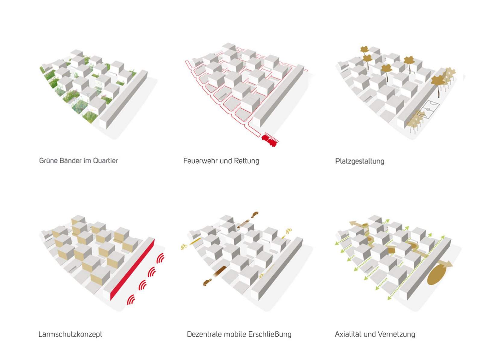 Das Gebiet wird durch die „Stange“ räumlich zum Mittleren Ring gefasst. Das dahinterliegende Feld bis zum Weißenseepark wird durch eine gleichmäßige Bebauung mit Studentenhäusern an Gassen und kleinen, den Häusern zugeordneten Gärten gestaltet. Die Bebauung durch die Studentenhäuser erlaubt eine gute, fußläufige Durchwegung in alle Richtungen. Die Siedlung ist in Ost-West-verlaufende Bänder aus Häusern, privaten Grünflächen, internen Plätzen und Gassen aufgebaut. Zusätzlich erfolgt eine Nord-Süd-Vernetzung entlang der höheren Häuser (mit den Gemeinschaftsräumen im Erdgeschoss) und den internen Plätzen.