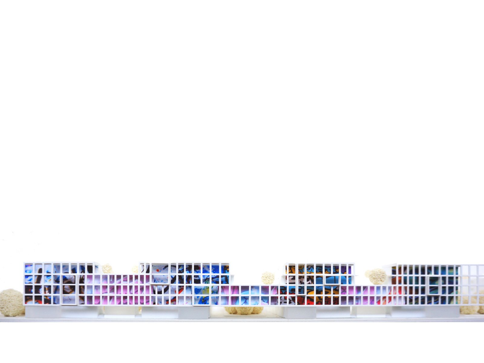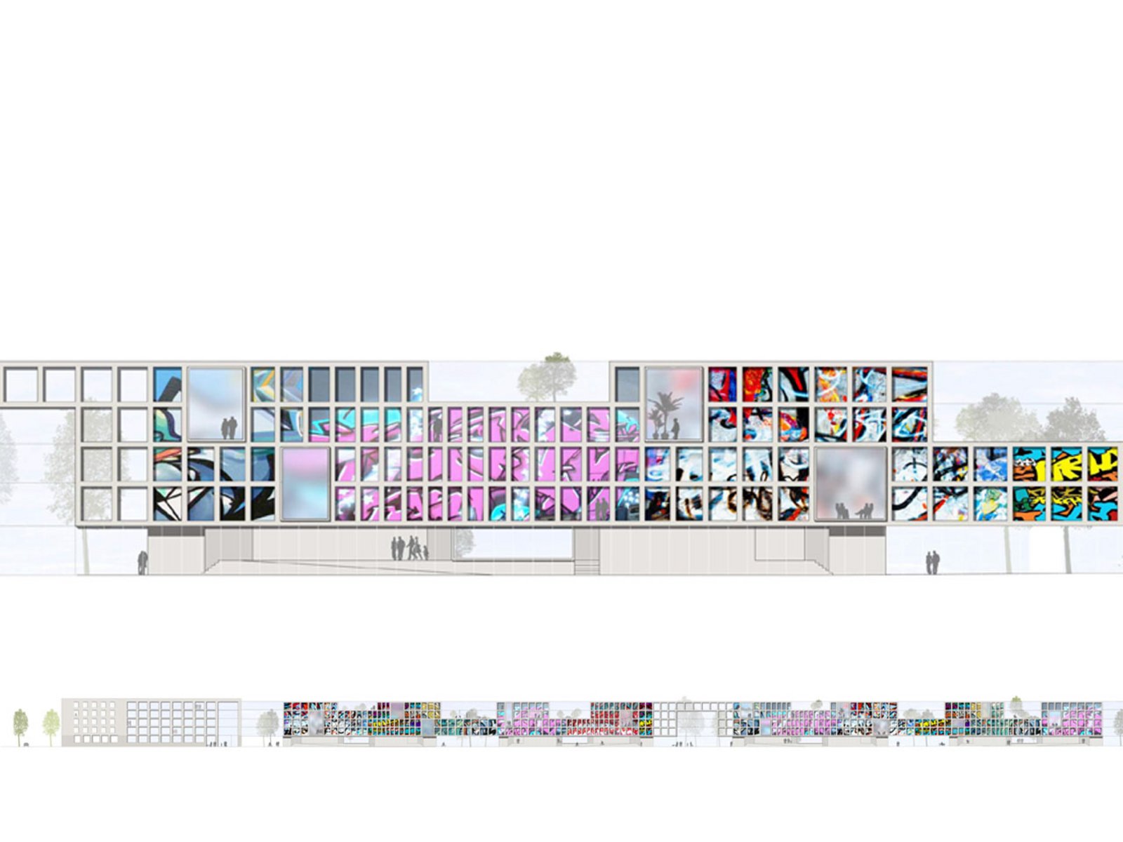 Das Quartier zeigt sich zum Frankfurter Ring mit einer über die gesamte Länge durchlaufenden, als Schallschutzpuffer fungierenden Rahmenstruktur, hinter der eine riesige Graffiti-Wand liegt. Diese Graffiti-Wand wird zum Superzeichen des Quartiers. Als Ausdruck jugendlicher Subkultur und in gewisser Weise als Volkskunst heutiger Großstädte kann sie ständiger Veränderung unterworfen sein und immer wieder für Gesprächsstoff sorgen. Die Graffiti-Wand wird zur hell ausgeleuchteten Bühne für ein gestalterisches und soziales Experiment, das für die Bewohner des Quartiers eine positive identitätsstiftende Wirkung entfalten kann.