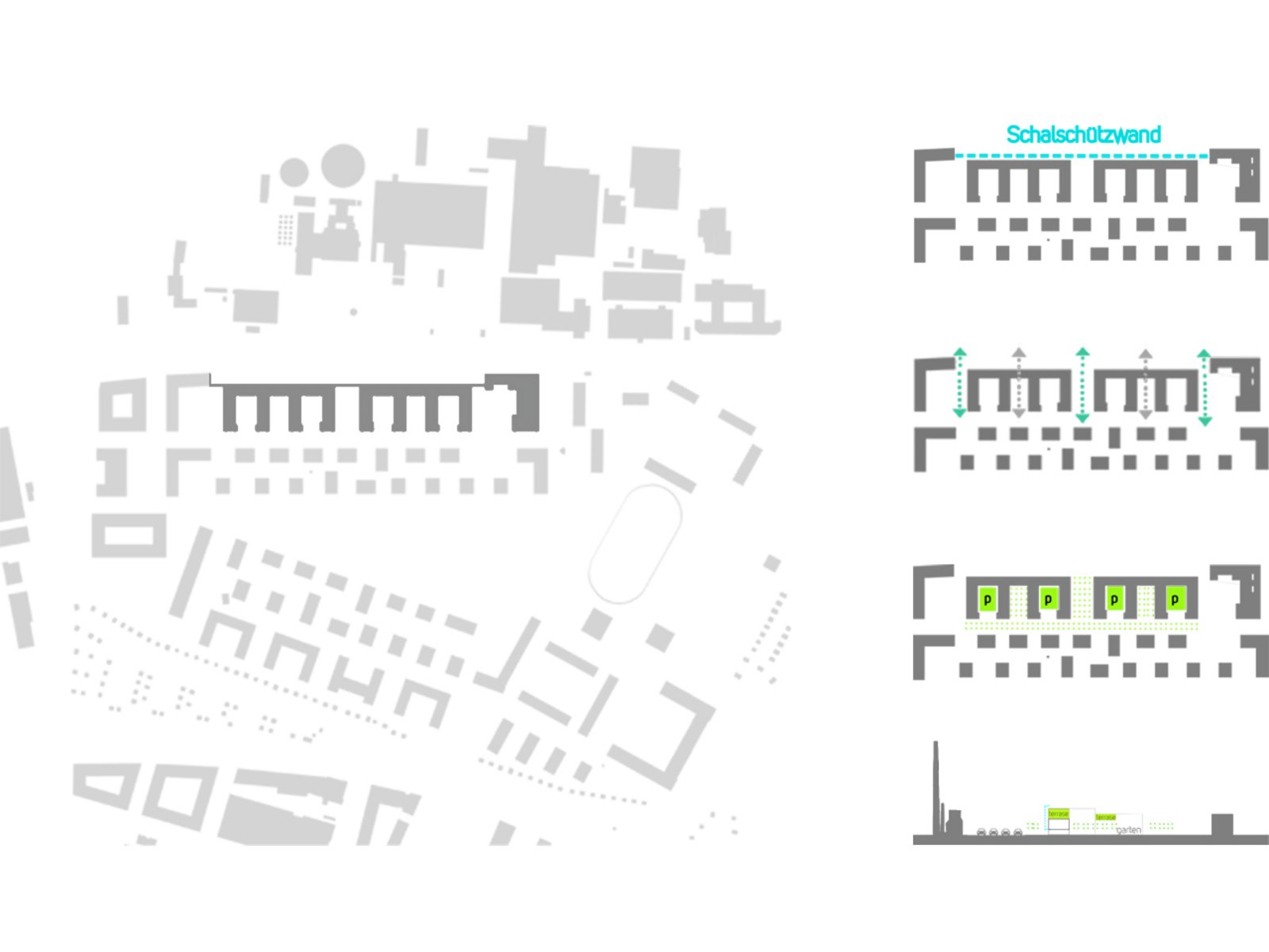 Im Bereich der Nordfassaden werden - mit Ausnahme der Eckwohnungen - verglaste Laubengänge realisiert, was für eine ausreichende Schallabschirmung der dahinter liegenden Wohnungsfassaden sorgt. Ausgewählte Bereiche des Laubengangs erhalten jedoch zur Erhöhung der Raumqualität Fenster mit Öffnungsmöglichkeit. Die Be- und Entlüftung aller Wohnungen erfolgt über die lärmabgewandten Seiten. Im Bereich der „eingeschnittenen“ Terrassen wird die Lärmschutzwand gebäudehoch fortgeführt, so dass auf den dahinter liegenden Außenwohnbereichen ein Beurteilungspegel von tags 59 db(a) nicht überschritten wird.