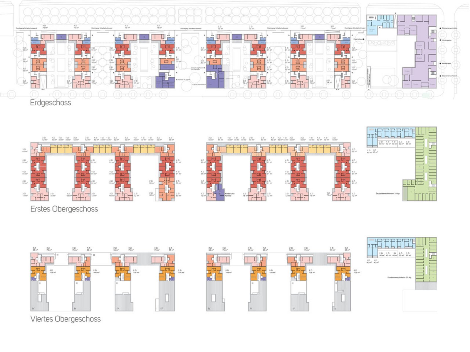 Die Kindereinrichtungen und das Studentenwohnheim werden von der Quartiersstraße aus erschlossen, das Clearinghauses über den eigenen Freibereich an der lärmgeschützten Nord-Süd-Wegeverbindung. Die drei Nutzungen sind in klar ablesbare Bereiche bzw. Bauteile gegliedert. Beide Kindereinrichtungen sind im Erdgeschoss vorgesehen, ebenso die Gemeinschaftsbereiche des Clearinghauses. Alle Gruppen- bzw. Gemeinschaftsräume sind lärmabgewandt den Gartenbereichen zugeordnet. Das Studentenwohnheim besitzt Gemeinschaftsterrassen im 1., 2. und 4.Obergeschoss.