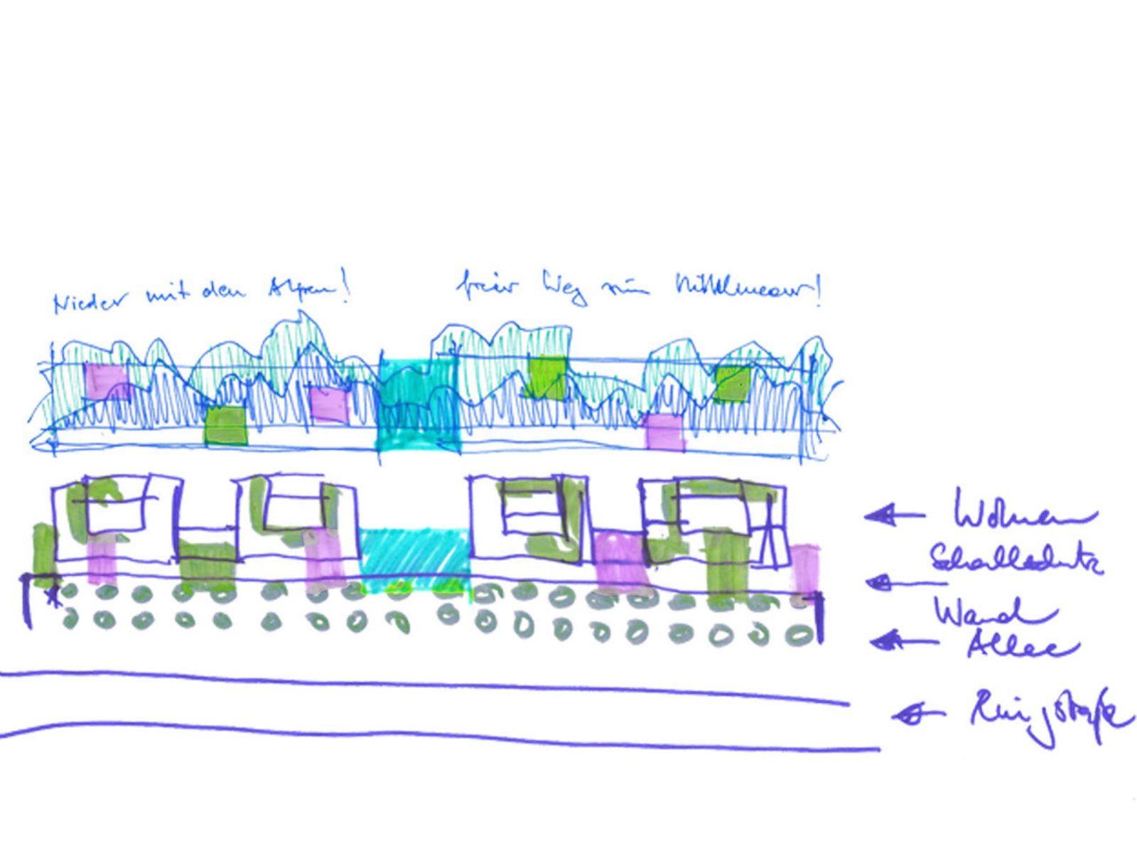 Die Randbebauung der gegenüber dem Frankfurter Ring zurückversetzten Wohnquartiere reagiert auf den großmaßstäblichen, von Verkehr und Gewerbegebiet geprägten Stadtraum im Norden. Die Länge der Baukörper, die Durchgängigkeit von plastischer Gliederung und Graffiti-Malerei, sowie die Verklammerung durch die Rahmenstruktur entsprechen dem Maßstab des Autoboulevards und der Wahrnehmung in der Bewegung. Akzentuierende Einschnitte in die Gebäudekontur geben Einblicke in die hinter der Schallschutzwand liegenden Freiräume und machen die Struktur des Wohnquartiers spürbar. Der Frankfurter Ring selbst bildet keine individuellen Adressen, diese befinden sich alle im Inneren des Quartiers. Die Randbebauung am Frankfurter Ring wird als markante, städtebauliche Grenze mit klar definierten Durchgängen für Fußgänger und Radfahrer verstanden. Die Allee vermittelt als Filter zwischen Ring und Wohnbebauung.