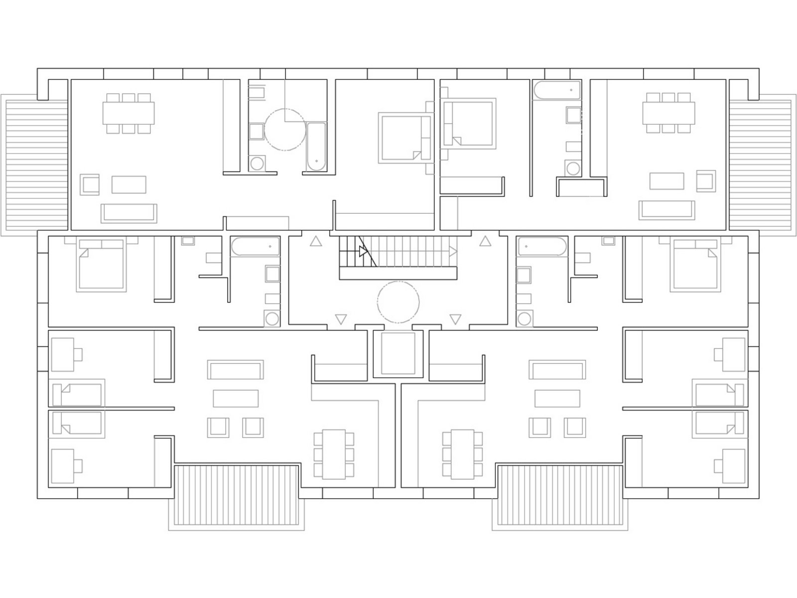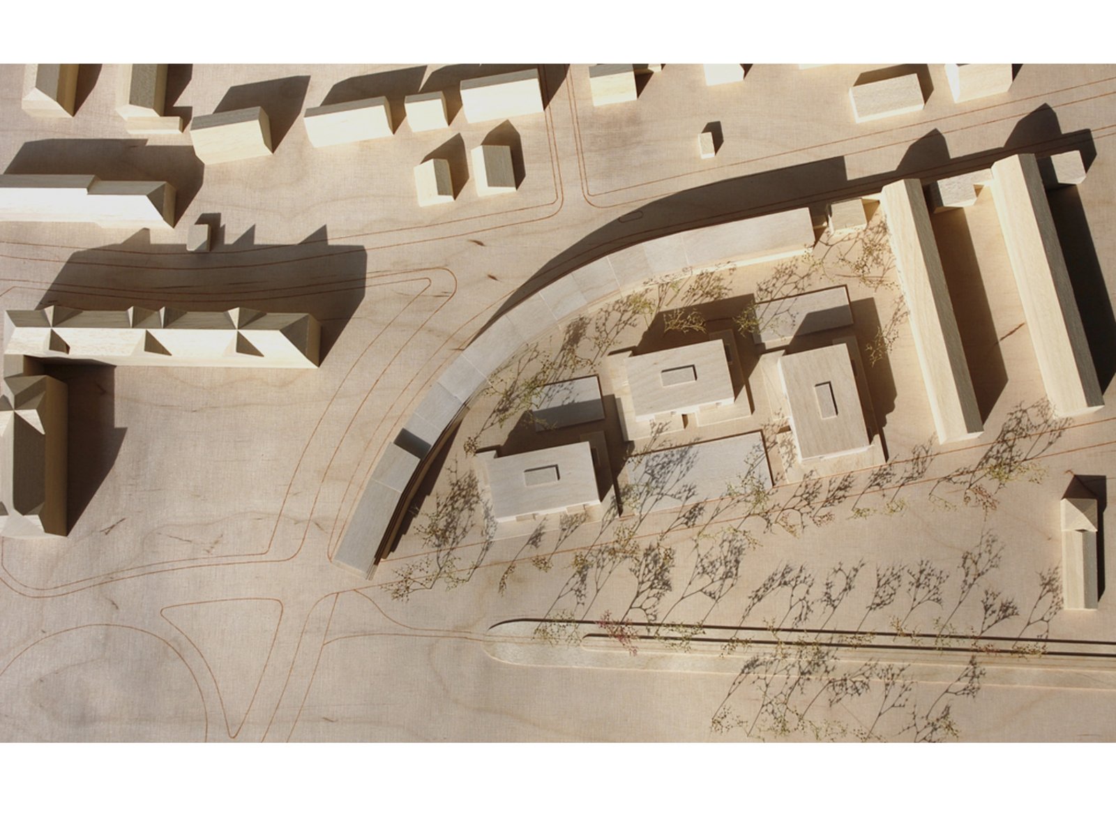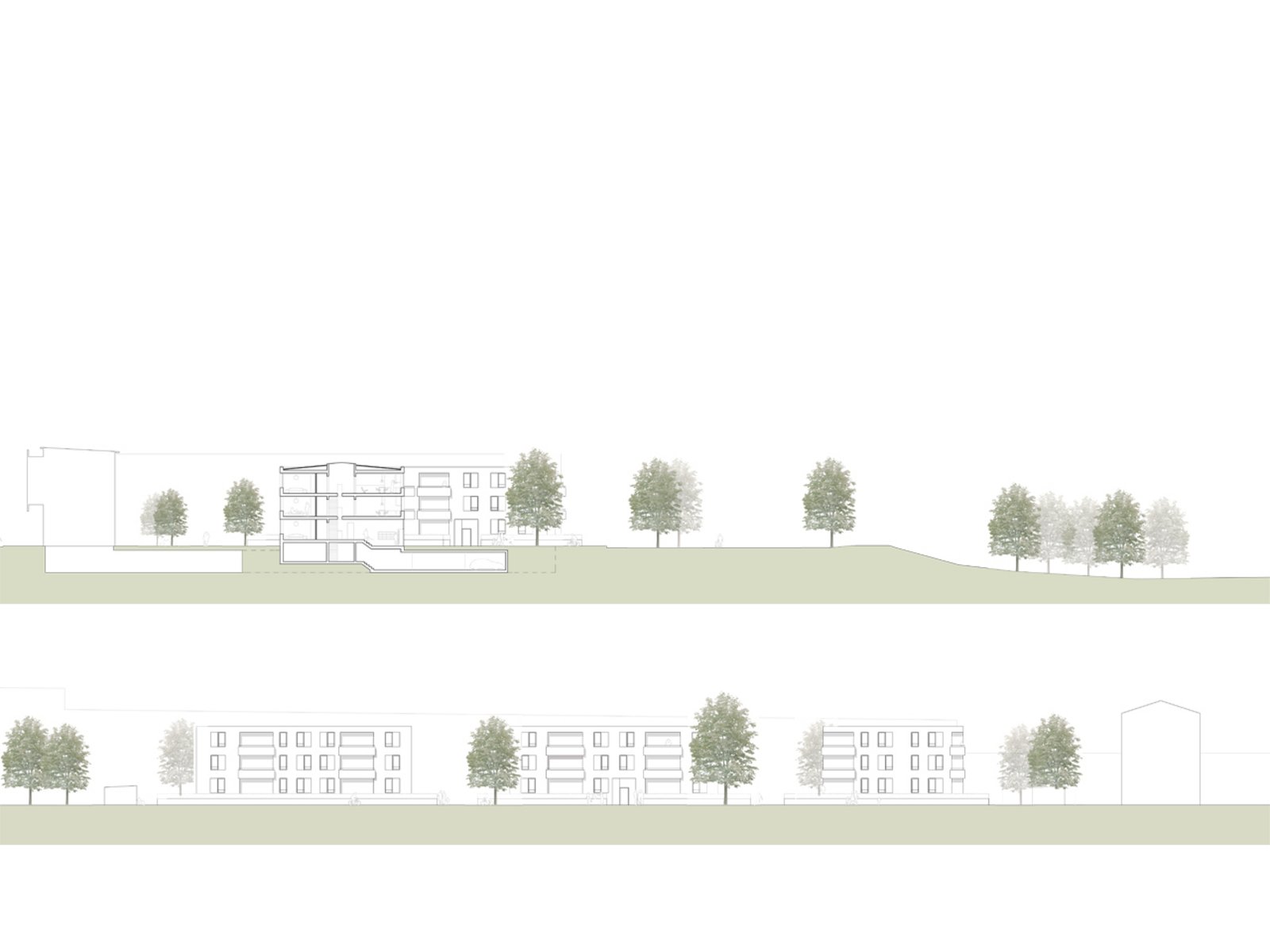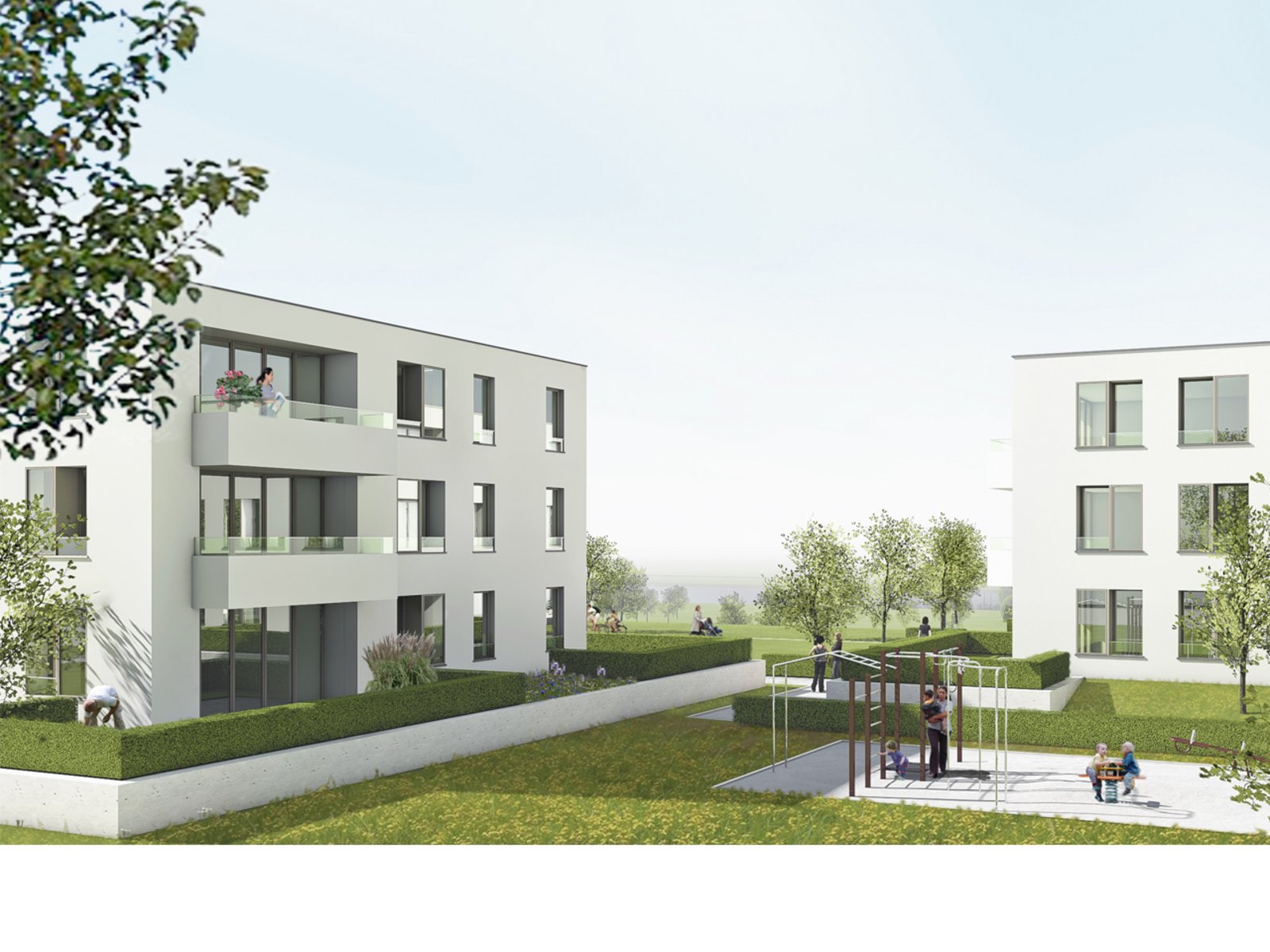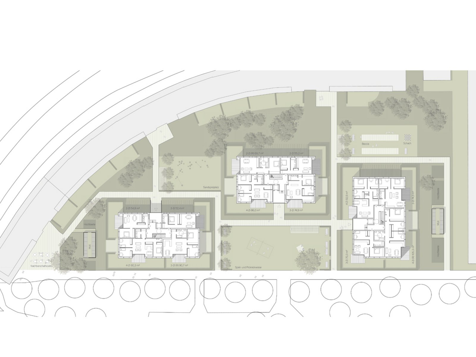 Ein Wegenetz, das der orthogonalen Struktur der drei neuen Gebäude folgt, verbindet diese mit der geschwungenen Randbebauung. Dem Wegenetz eingeschrieben finden sich neben reinen Grün- und Pflanzflächen unterschiedlich nutzbare Frei- und Spielflächen für Bewohner aller Altersstufen, die in ihrer Gesamtheit als ein „Garten für alle Nachbarn“ begriffen werden. Wegenetz und Freiflächen schaffen vielschichtige Bezüge und verzichten ebenso wie die Baukörper auf klare Hierarchien.